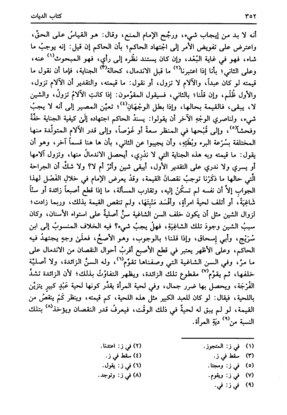 أنه لا بد من إيجاب شيء، ورجَّح الإِمام المنع، وقال: هو القياسُ على الحقِّ، واعترض على تفويض الأمر إلى اجْتهاد الحاكم؛ بأن الحاكم إن قيل: إنه يوجبُ ما شاء، فهو في غاية البُعْد، وإن كان يستند نظْره إلى رأي، فهو المبحوث (¬1) عنه، وعلى الثاني؛ بأنا إذا اعتبرنا (¬2) ما قبل الاندمال، كحالة (¬3) الجناية، فإما أن نقول ما قيمته لو كان عبداً، والآلام لا تزول، أو نقول: ما قيمته، والتقدير أن الآلام تزول، والأول ظُلْم، وإن قلْنا؛ بالثاني، فسيقول المقوِّمون: إذا كانتِ الآلامُ تزولُ، والشين لا، يبقى، فالقيمة بحالها، وإذا بطل الوجْهَانِ (¬4)؛ تعيَّن المصير إلى أنه لا يجبُ شيء، ولناصري الوجْهِ الآخر أن يقولوا: يسندُ الحاكم اجتهاده إلَى كيفية الجناية خفَّةً وفحشاً (¬5)، وإلى قُبْحها في المنظر سعةً أو غَوصاً، وإلى قدر الآلام المتولِّدة منها المختلفة بسُرْعة البرء وبُطَئِهِ، وأن يجيبوا عن الثاني، بأن هاهنا قسماً آخر، وهو أن يقول: ما قيمته وبه هذه الجناية التي لا ندْرِي، أيحصل الاندمالُ منها، وتزول آلامها أو يسري ولا ندري على التقدير الأول، أيبقى شين وأثرٌ أم لا؟ ولا شكَّ أن الجراحة الَّتي حالها ما ذكَرْنا توجبُ نقصانَ القيمة، وقدْ يعرض الإِمام في خلالِ الفَصْل لهذا الجواب إلاَّ أن نفسه لم تسكُنْ إليه، وتقارب المسألة، ما إذا قطع أصبعاً زائدة أو سنّاً شَاغِيَةً، أو أتلف لحيةَ امرأةٍ، وأفْسَد مَنْبِتَهَا, ولم تنقص القيمة بذلك، وربما زادت؛ لزوال الشين مثل أن يكون خلف السنن الشاغية سنٌّ أصليةٌ على استواء الأسنان، وكان سببُ الشين وجودَ تلك الشاغِيَةِ، فهلْ يجبُ شيء؟ فيه الخلاف المنسوبُ إلى ابن سُرَيْج، وأبي إِسحاق، وإذا قلنا؛ بالوجوب، وهو الأصحُّ، فعلَى وجهٍ يجتهدُ فيه الحاكم، وعلى الأظهر يعتبر في قطع الأصبع أقربُ أحوال النقصان من الاندمال على ما مرَّ، وفي السنن الشاغية التي وصفناها تقوَّم (¬6)، وله السنُّ الزائدة، ولا أصليَّة خلفها، ثم يقوَّم (¬7) مقطوع تلك الزائدة، ويظهر التفاوُتُ بذلك؛ لأن الزائدة تشدُّ الفُرْجَة، ويحصل بها ضرر جمال، وفي لحية المرأة يقدَّر كونها لحية عَبْدٍ كبير يتزيَّن باللحية، فيقال: لو كان للعبد الكبير مثل هذه اللحية، كم قيمته، وينظر كَمْ ينقصُ من القيمة، لو لم يبق له لحيةٌ في ذلك الوقت، فيعرفُ قدر النقصان ويؤخذ (¬8) بتلك النسبة من (¬9) ديَةِ المرأة.