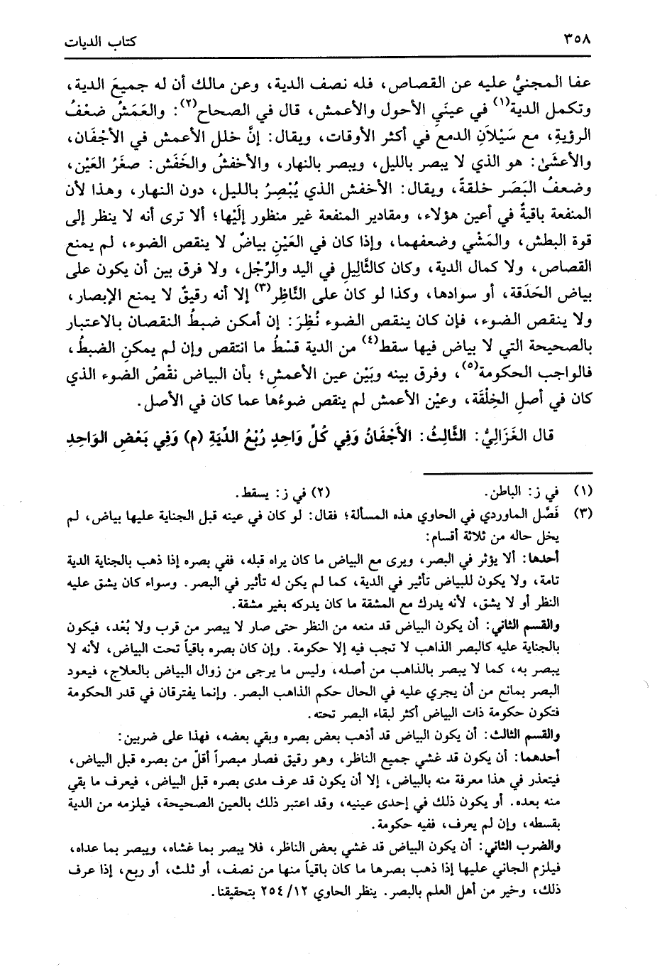 والضرب الثاني: أن يكون البياض قد غشي بعض الناظر، فلا يبصر بما غشاه، ويبصر بما عداه، فيلزم الجاني عليها إذا ذهب بصرها ما كان باقياً منها من نصف، أو ثلث، أو ربع، إذا عرف ذلك، وخير من أهل العلم بالبصر. ينظر الحاوي 12/ 254 بتحقيقنا.