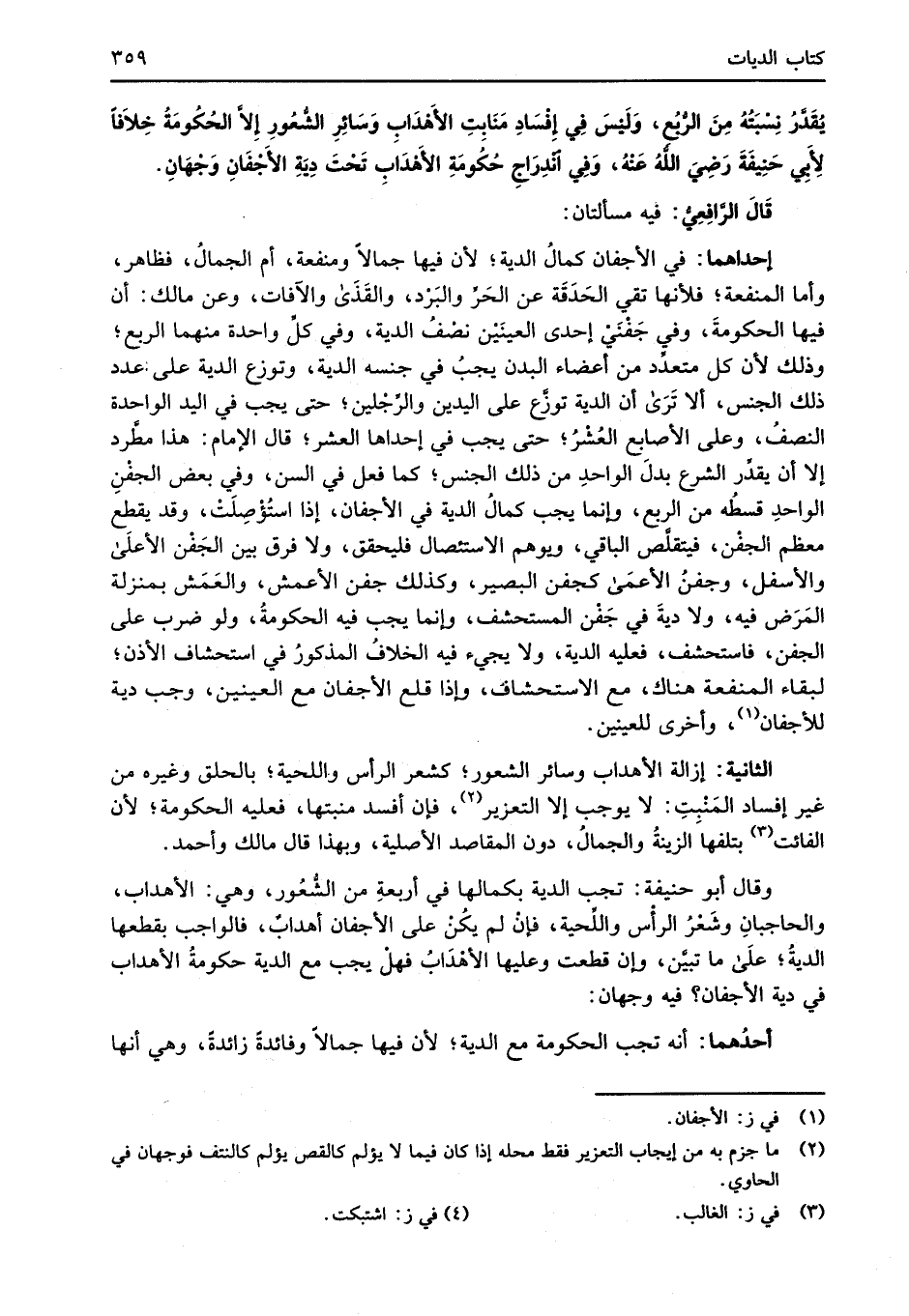 يُقَدَّرُ نِسْبَتُهُ مِنَ الرُّبُع، وَلَيْسَ فِي إِفْسَادِ مَنَابِتِ الأهْدَابِ وَسَائِرِ الشُّعُورِ إِلاَّ الحُكُومَةُ خِلاَفاً لِأَبِي حَنِيْفَةَ رَضِيَ اللهُ عَنْهُ، وَفِي انْدِرَاجِ حُكُومَةِ الأهْدَابِ تَحْتَ دِيَةِ الأَجْفَانِ وَجْهَانِ.
