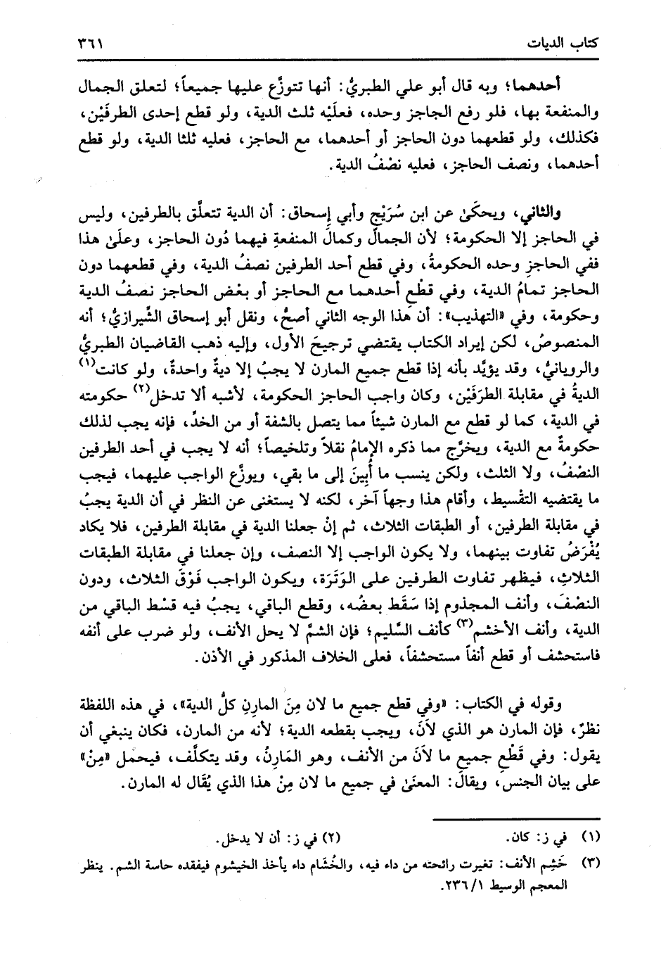 والثاني، ويحكَى عن ابن سُرَيْجٍ وأبي إِسحاق: أن الدية تتعلَّق بالطرفين، وليس في الحاجز إلا الحكومة؛ لأن الجمال وكمالَ المنفعةِ فيهما دُون الحاجز، وعلَى هذا ففي الحاجزِ وحده الحكومةُ، وفي قطع أحد الطرفين نصفُ الدية، وفي قطعهما دون الحاجز تمامُ الدية، وفي قطعِ أحدهما مع الحاجز أو بعض الحاجز نصفُ الدية وحكومة، وفي "التهذيب": أن هذا الوجه الثاني أصحُّ، ونقل أبو إسحاق الشِّيرازيُّ؛ أنه المنصوصُ، لكن إيراد الكتاب يقتضي ترجيحَ الأول، وإليه ذهب القاضيان الطبريُّ والرويانيُّ، وقد يؤيَّد بأنه إذا قطع جميع المارن لا يجبُ إلا ديةٌ واحدةٌ، ولو كانت (¬1) الديةُ في مقابلة الطرَفَيْن، وكان واجب الحاجز الحكومة، لأشبه ألا تدخل (¬2) حكومته في الدية، كما لو قطع مع المارن شيئاً بما يتصل بالشفة أو من الخدِّ، فإنه يجب لذلك حكومةٌ مع الدية، ويخرَّج مما ذكره الإمامُ نقلاً وتلخيصاً أنه لا يجب في أحد الطرفين النصْفُ، ولا الثلث، ولكن ينسب ما أُبِينَ إلى ما بقي، ويوزَّع الواجب عليهما، فيجب ما يقتضيه التقْسيط، وأقام هذا وجهاً آخر، لكنه لا يستغنى عن النظر في أن الدية يجبُ في مقابلة الطرفين، أو الطبقات الثلاث، ثم إنْ جعلنا الدية في مقابلة الطرفين، فلا يكاد يُفْرَضُ تفاوت بينهما, ولا يكون الواجب إلا النصف، وإن جعلنا في مقابلة الطبقات الثلاثِ، فيظهر تفاوت الطرفين على الوَتَرَة، ويكون الواجب فَوْقَ الثلاث، ودون النصْفَ، وأنف المجذوم إذا سَقَط بعضُه، وقطع الباقي، يجبُ فيه قسْط الباقي من الدية، وأنف الأخشم (¬3) كأنف السَّليم؛ فإن الشمَّ لا يحل الأنف، ولو ضرب على أنفه فاستحشف أو قطع أنفاً مستحشفاً، فعلى الخلاف المذكور في الأذن.