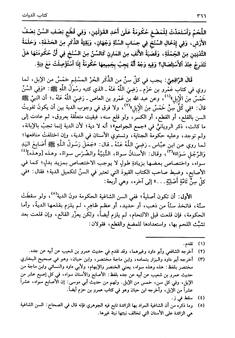 قَالَ الرَّافِعِيُّ: يجب في كلِّ سنٍّ من الذَّكَر الحُرِّ المسْلِمِ خمْسٌ من الإبل، لما روي في كتاب عَمْرو بن حَزْم -رَضِيَ اللهُ عَنْهُ- الذي كتبه رسُولُ اللهِ -صلى الله عليه وسلم-: "وَفِي السِّنِّ خَمْسٌ مِنَ الْإبِلِ" (¬1)، وعن عبد الله بن عَمْرو بن العاص -رَضِيَ اللهُ عَنْهُ-؛ أن النبىَّ -صلى الله عليه وسلم- قَالَ: "فِي كُلِّ سِنِّ خَمْسٌ مِنَ الإبِلِ" (¬2)، ولا فرق في وجوب الدية بين أن يكونَ تفويتُ السن بالقلع، أو القطع، أو الكسر، ولو قلع سنه، فبقيت متعلِّقة بعروق، ثم عادت إلى ما كانت، ذكر الرويانيُّ في "جمع الجوامع"؛ أنه لا دية؛ لأن الدية إنما تجبُ بالإبانة، ولم توجد، وعليه حكومة الجناية، وتستوي الأسنان في الدية، وإن اختلفتْ منافعها؛ لما روي عن ابن عباس -رَضِيَ اللهُ عَنْهُ- قال: "جَعَلَ رَسُولُ اللهِ -صلى الله عليه وسلم- أَصَابعَ اليَدِ وَالرِّجْلِ سَوَاءً" (¬3)، وقال: الأسنانُ سواءٌ، الثَّنِيَّةُ والضِّرْس سواءٌ، وهذه [وهذه] (¬4) سواء، واختصاص بعضها بزيادةِ طولٍ لا يوجب الاختصاص بمزيد بدلٍ؛ كما في الأصابع، وضبط صاحب الكتاب القيودَ التي تعتبر في السنِّ لتكميل الدية؛ فقال: "في كلِّ سِنٍّ تَامَّةٍ أَصْلِيَّةٍ ... " إلى آخره، وهي أربعة:
