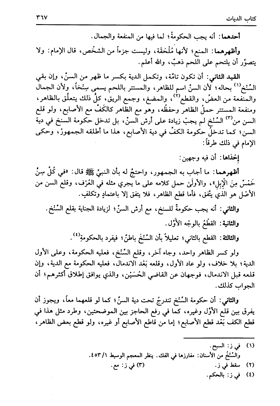 القيد الثاني: أن تكون تامَّة، وتكمل الدية بكسر ما ظهر من السنِّ, وإن بقي السِّنْخ (¬1) بحاله؛ لأن السنَّ اسم للظاهر، والمستتر باللحم يسمى سِنْخاً، ولأن الجمال والمنفعة من العضِّ، والقطع (¬2)، والمضغ، وجمع الريق، كلُّ ذلك يتعلَّق بالظاهر، ومنفعة المستتر حملُ الظاهر وحفظُه، وهو مع الظاهر كالكَفِّ مع الأصابع، ولو قلع السنن من (¬3) السِّنْخ لم يجبْ زيادة على أرش السنِّ, بل تدخل حكومة السنخ في دية السن؛ كما تدخلُ حكومة الكفِّ في دية الأصابع، هذا ما أطلقه الجمهورُ، وحكى الإِمام في ذلك طرقاً: