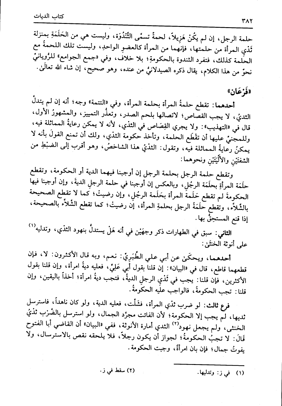 حلمة الرجل، إن لم يكُنْ هَزِيلاً، لحمةٌ تسمَّى الثَّنْدُوَة، وليست هي من الحَلَمَةِ بمنزلة ثَدْيِ المرأة من حلمتها، فإنهما من المرأة كالعضوِ الواحدِ، وليست تلك اللحمةُ مع الحَلمة كذلك، فتفرد الثندوة بالحكومةِ؛ بلا خلاف، وفي "جمع الجوامع" للرُّويانيِّ نحوٌ من هذا الكلام، يقال ذكره الصيدلانيُّ من عنده، وهو صحيح، إن شاء الله تعالَى.