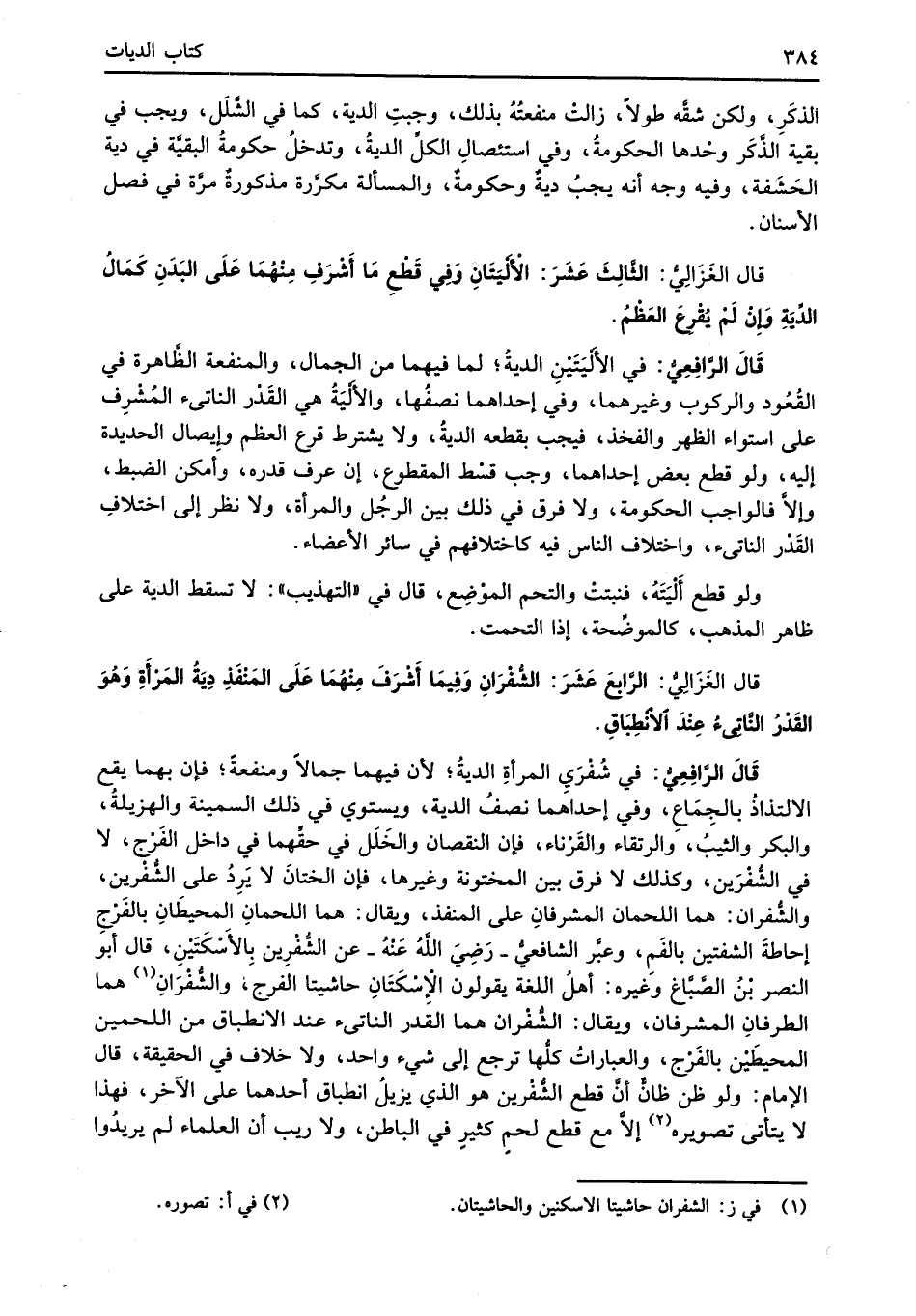 قال الغَزالِيُّ: الرَّابعَ عَشَرَ: الشُّفْرَانِ وَفِيمَا أَشْرَفَ مِنْهُمَا عَلَى المَنْفَذِ دِيَةُ الَمَرْأَةِ وَهُوَ القَدْرُ النَّاتِئُ عِنْدَ الانْطِبَاقِ.