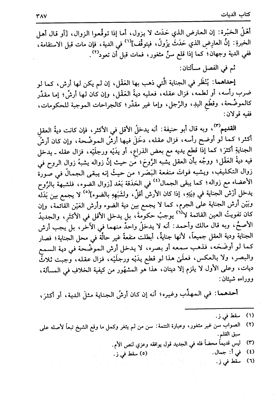 القديم (¬3)، وبه قال أبو حنيفة: أنه يدخلُ الأقل في الأكثر، فإن كانت ديةُ العقلِ أكثر؛ كما لو أوضح رأسه، فزال عقله، دخَلَ فيها أرشُ الموضِّحة، وإن كان أرشُ الجنايةِ أكثرَ؛ كما إذا قطع يديه مع بعض الذراعِ، أو يدَيْه ورجلَيْه، فزال عقله -يدخل فيه ديةُ العَقل؛ ووجّه بأن العقل يشبه الرُّوحَ؛ من حيث إنَّ زواله يشبهُ زوال الروح في زوال التكليفِ، ويشبه فواتَ منفعة البَصَر؛ من حيثُ إنه يبقى الجمالُ في صورة الأعضاء مع زواله؛ كما يبقى الجمال (¬4) في الحَدَقة بَعْد [زوال الضوء، فلشبهة بالرُّوح يدخل أرْش الجناية في دِيَتِهِ، إذا كان الأرش أقلَّ، ولشَبَهِهِ بالضوء] (¬5) لا يجمع بين بَدَله وبَيْن أرش الجناية على الجرم، كما لا يجمع بين دية الضوء وأرش العَيْن القائمة، وإن كان تفويتُ العين القائمة لا (¬6) يوجبُ حكومةَ، بل يدخل الأقل في الأكثَرِ، والجديدُ الأصحُّ، وبه قال مالك وأحمد: أنه لا يدخلُ واحدٌ منهما في الآخر، بل يجب أرش الجناية ودية العقل جميعًا؛ لأنها جنايةٌ، أبطلت منفعةً غير حالَّة في محل الجناية؛ فصار كما لو أوضَحَه، فذهب سمعه أو بصره، لا يدخل أرش الموضِّحة في دية السمع والبصر، ولا بالعكس، فعلى هذا لو قطع يدَيْه ورجلَيْه، فزال عقله، وجبت ثلاثُ ديات، وعلى الأول لا يلزم إلا ديتان، هذا هو المشهُور من كيفية الخلافِ في المسألة، ووراءه شيئان: