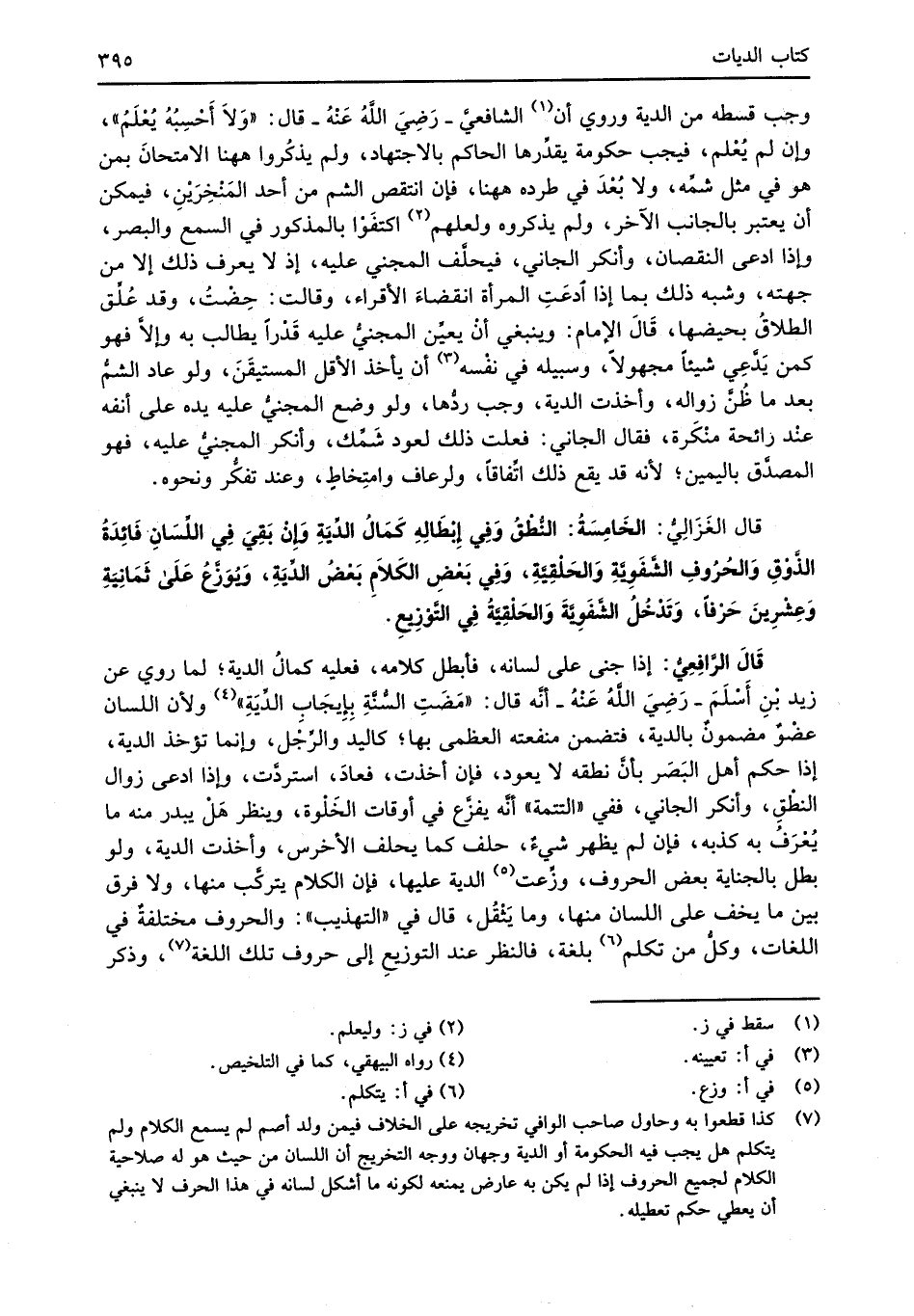 قال الغَزَالِيُّ: الخَامِسَةُ: النُّطْقُ وَفِي إِبْطَالِهِ كَمَالُ الدِّيَةِ وَإِنْ بَقِيَ فِي اللِّسانِ فَائِدَةُ الذَّوْقِ والحُرُوفِ الشَّفَوِيَّةِ والحَلْقيَّةِ، وَفِي بَعْضِ الكَلاَمِ بَعْضُ الدِّيَةِ، وَيُوَزَّع عَلَى ثَمَانِيَةِ وَعِشْرِينَ حَرْفاً، وَتَدْخُلُ الشَّفَوِيَّةَ والحَلْقِيَّةُ فِي التَّوْزِيعِ.