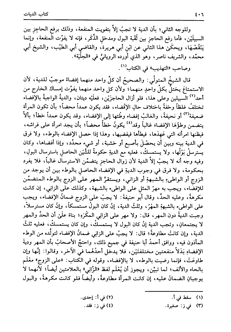 قال الشيخُ المتولِّي: والصحيحُ أن كلَّ واحد منهما إفضاءٌ موجبٌ؛ للدية؛ لأن الاستمتاعَ يختلُّ بكلِّ واحدٍ منهما؛ ولأن كل واحد منهما يفوِّت إمساك الخارج من أحد (¬2) السبيلين وعلى هذا، فلو أزال الحاجزَيْن، فعلَيْه ديتان، والديةُ الواجبةُ بالإفضاء تختلفُ غلظًا وخفة باختلاف حالِ الإفْضاء، فقد يكون عمدًا محضًا؛ بأن تكون المرأة ضعيفة (¬3) أو نحيفةً، والغالبُ إفضاء وطْئها إلى الإفضاء، وقد يكون عمدًا خطأ؛ بألاَّ يتضمن وطؤُهَا الإفضاءَ غالبًا وقد (¬4) يكونُ خطأً محضًا؛ بأن يجد امرأة على فراشه، فيظنها امرأته التي عَهِدَها، فيطأها فيفضيها، وهذا إذا حصل الإفضاء بالوطء، ولا فرق في الدية بينه وبين أن يحصُلَ بأصبع أو خشبة، أو شيء محدَّد، وإذا أفضاها، وكان يسترسلُ بَوْلُها، ولا يستمسكُ، فعليه مع الديةِ حكومةٌ للشَّيْن الحاصلِ باسترسال البولِ، وفيه وجه أنه لا يجب إلاَّ الدية لأن زوال الحاجزِ يتضمَّن الاسترسال غالبًا، فلا يفرد بحكومة، ولا فرق في وجوب الديةِ في الإفضاء الحاصلِ بالوطء بين أن يوجد من الزوجِ أو الواطئِ بالشبهةِ أو الزاني، ويستقرُّ المهر على الزوج بالوطء المتضمِّن للإفضاء، ويجب به مهرُ المثلِ على الواطئ بالشبهة، وكذلك على الزانِي، إن كانت مكرهةً، وعليه الحدُّ، وقال أبو حنيفةَ: لا يجبُ على الزوج ضمانُ الإفضاء، ويجب على الواطئ بالشبهةِ المهْرُ، وثلثُ الدية، إنْ كان البولُ مستمسكًا، وإن كان مسترسلًا، وجبت الديةُ دون المهر، قال: ولا مهر على الزانِي المكْرَهِ؛ بناءً عَلَى أن الحدَّ والمهر لا يجتمعانِ، وتجب الدية إنْ كان البول لا يستمسكُ، وإن كان يستمسكُ، فعليه ثلثُ الدية، وإن كانتْ مطاوعةً؛ قال: لا يجبُ على الزانِي ضمانُ الإفضاء لتولُّده من الوطء المأذون فيه، ووافق أحمدُ أبا حنيفة في جميع ذلك، واحتجَّ الأصحابُ بأن المهر وديةَ الإفضاءِ بَدَلاً منفعتين مختلفتَيْن، فلا يدخل أحدُهُما في الآخر، وقالوا: إنَّها وإن طاوعَتْ، فإنما رضيت بالوطء، لا بالإفضاء، وقوله في الكتاب: "على الزوج" معْلَم بالحاء والألف؛ لما تبيَّن، ويجوز أن يُعْلَم لفظ "الزَّانِي" بالعلامتين أيضًا؛ لأنهما لا يوجبانِ الضمانَ عليه، إن كانت المرأة مطاوعةً، وأيضًا فلو كانت مكرهةً، والبول