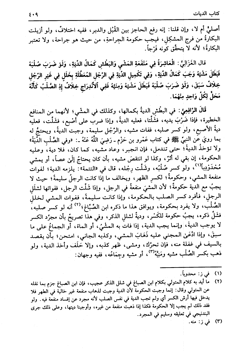 قال الغَزَالِيُّ: العَاشِرَةُ فِي مَنْفَعَةِ المَشْيِ والبَطْشِ كَمَالُ الدِّيَةِ، وَلَوْ ضَرَبَ صُلْبَهُ فَبَطَلَ مَشْيُهُ وَجَبَ كَمَالُ الدِّيَةِ، وَفِي تَكْمِيلِ الدِّيَةِ فِي الرِّجْلِ المُعَطَّلَةِ بِخَلَلٍ فِي غَيْرِ الرِّجْلِ خِلافٌ سَبَقَ، وَلَوْ ضَرَبَ صُلْبَهُ فَبَطَلَ مَشْيُهُ وَمِنَيُّهُ فَفِي الانْدِراجِ خِلاَفٌ إِذِ الصُّلبُ كَأَنَّهُ مَحَلٌّ لِكُلِّ واحِدٍ مِنْهُمَا.
