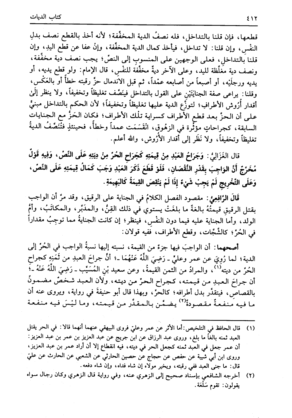 قال الغَزَالِيُّ: وَجَرَاحُ العَبْدِ مِنْ قِيمَتِهِ كَجَرَاحِ الحُرِّ مِنْ دِيَتِهِ عَلَى النَّصِّ، وَفِيهِ قَولٌ مُخَرَّجٌ أَنَّ الواجِبَ بِقَدْرِ النُّقْصَانِ، فَلَوْ قَطَعَ ذَكَرَ العَبْدِ وَجَبَ كَمالُ قِيمَتِهِ عَلَى النَّصِّ، وَعَلَى التَّخْرِيجِ لَمْ يَجِبْ شَيْءٌ إِذَا لَمْ يَنْقِصَ القِيمَةُ كَالبَهِيمَةِ.