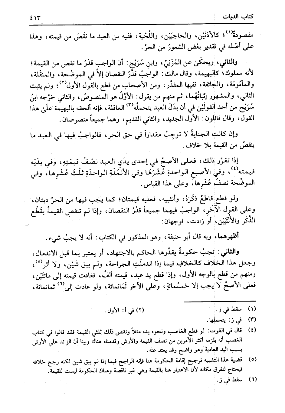(¬4) قال في القوت: لو قطع الغاصب ونحوه يده مثلًا ونقص ذلك ثلثي القيمة فقد قالوا في كتاب الغصب أنه يلزمه أكثر الأمرين من نصف القيمة والأرش وقدمناه هناك وبينا أن الزائد على الأرش بسبب اليد العادية وهو واضح وقد يعتد عنه.