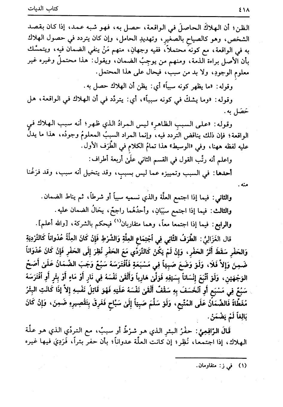 قال الغَزَالِيُّ: الطَّرَفُ الثَّانِي فِي اجْتِمَاعِ العِلَّةِ والشَّرْطِ فَإنْ كَانَ العِلَّةُ عُدْواناً كالتَّرْدِيَةِ والحَفْرِ سَقَطَ أَثَرُ الحَفْرِ، وَإِنْ لَمْ يَكُنْ كالتَّرَدِّي مَعَ الحَفْرِ نُظِرَ إِلَى الحَفْرِ فَإِنْ كَانَ عُدْوانًا ضَمِنَ وإلاَّ فَلاَ، وَلَوْ وَضَعَ صَبِيًّا فِي مَسْبَعَةٍ فافْتَرَسهُ سَبُعٌ وَجَبَ الضَّمَانُ عَلَى أَصَحِّ الوَجْهَيْنِ، وَلَوْ اتَّبَعَ إِنْسانًا بِسَيفِهِ فَوَلَّى هَارِبًا وَأَلْقَى نَفْسَهُ فِي نَارٍ أَوْ مَاء أَوْ بِئْرٍ أَو افْتَرَسَهُ سَبعٌ فِي مَسْبَعٍ أَوِ انْخَسَفَ بِهِ سَقْفٌ أَلْقَى نَفْسَهُ عَلَيْهِ فَهُوَ قَاتِلُ نَفْسِهِ إِلاَّ إذَا كَانَتِ البِئْرُ مُغَطَّاة فالضَّمانُ عَلَى المُتَّبعِ، وَلَوْ سَلْمَ صَبِيًّا إلى سَبَّاحِ فَغَرِقَ بِتَقْصِيرِهِ ضَمِنَ، وَإِنْ كَانَ بالِغًا لَمْ يَضْمَنْ.