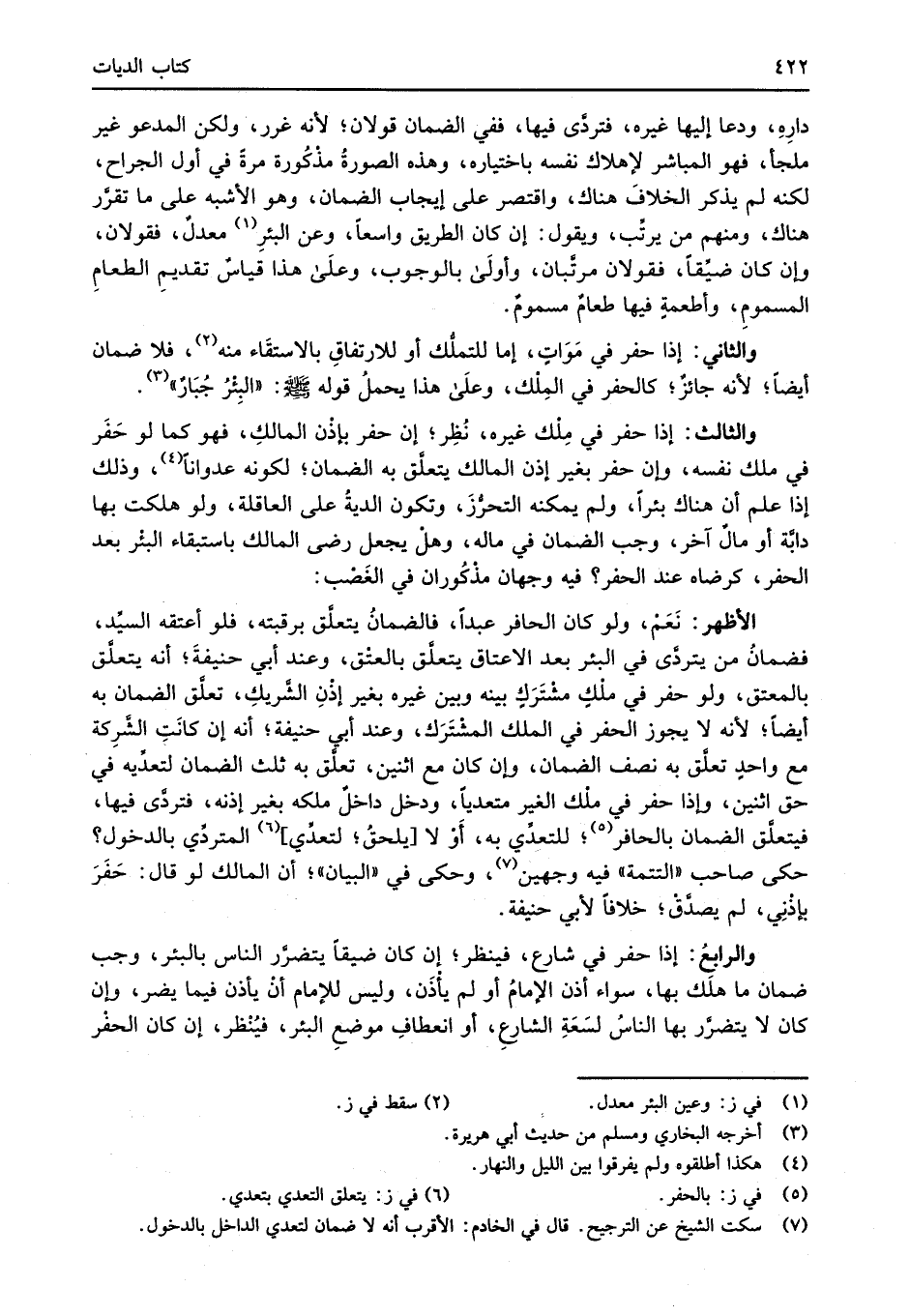 والرابعُ: إذا حفر في شارع، فينظر؛ إن كان ضيقًا يتضرَّر الناس بالبئر، وجب ضمان ما هلَك بها، سواء أذن الإمامُ أو لم يأْذَن، وليس للإمام أنْ يأذن فيما يضر، وإن كان لا يتضرَّر بها الناسُ لسَعَةِ الشارعِ، أو انعطافِ موضعِ البئر، فيُنْظر، إن كان الحفْر