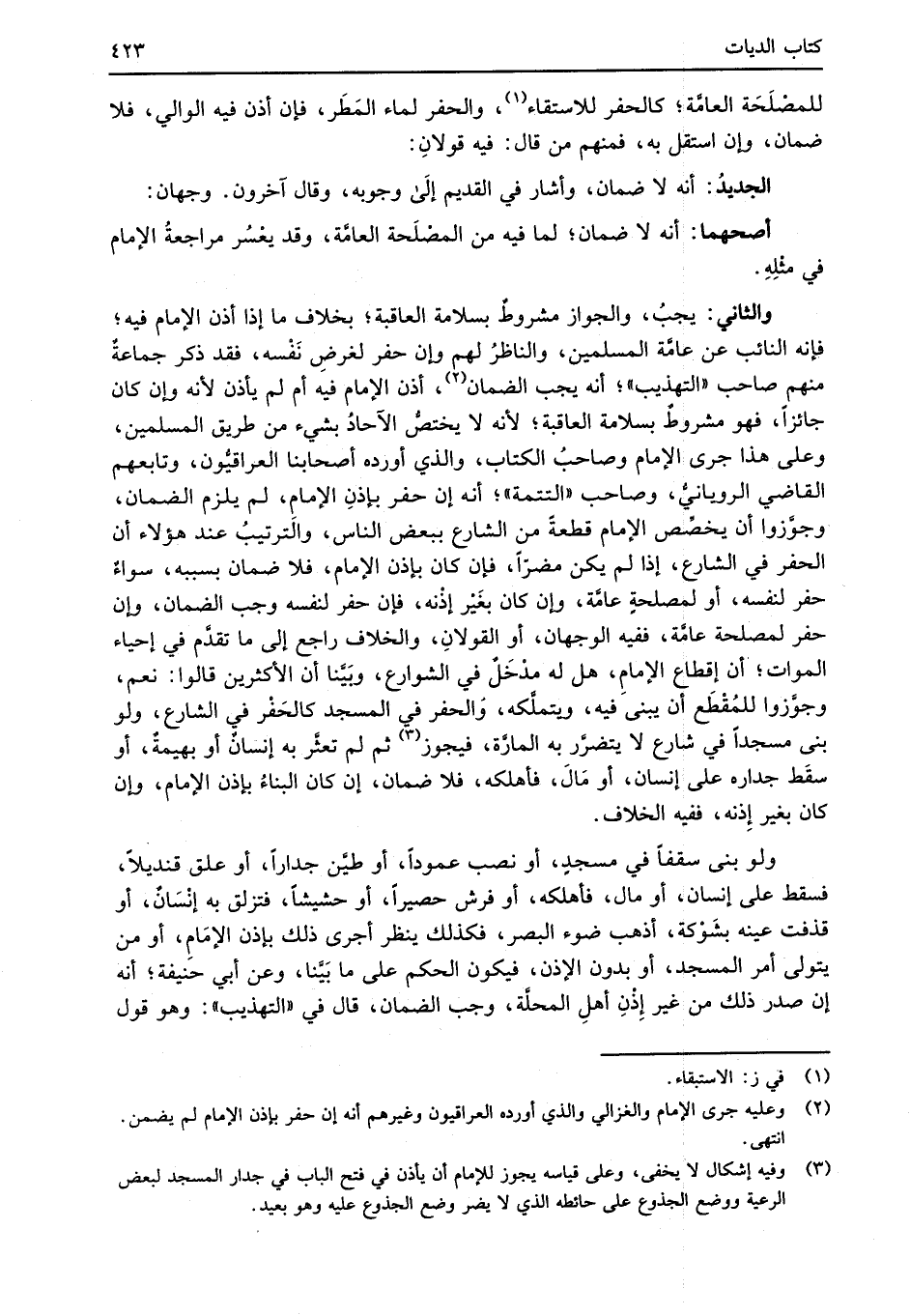 (¬2) وعليه جرى الإِمام والغزالي والذي أورده العراقيون وغيرهم أنه إن حفر بإذن الإِمام لم يضمن. انتهى.