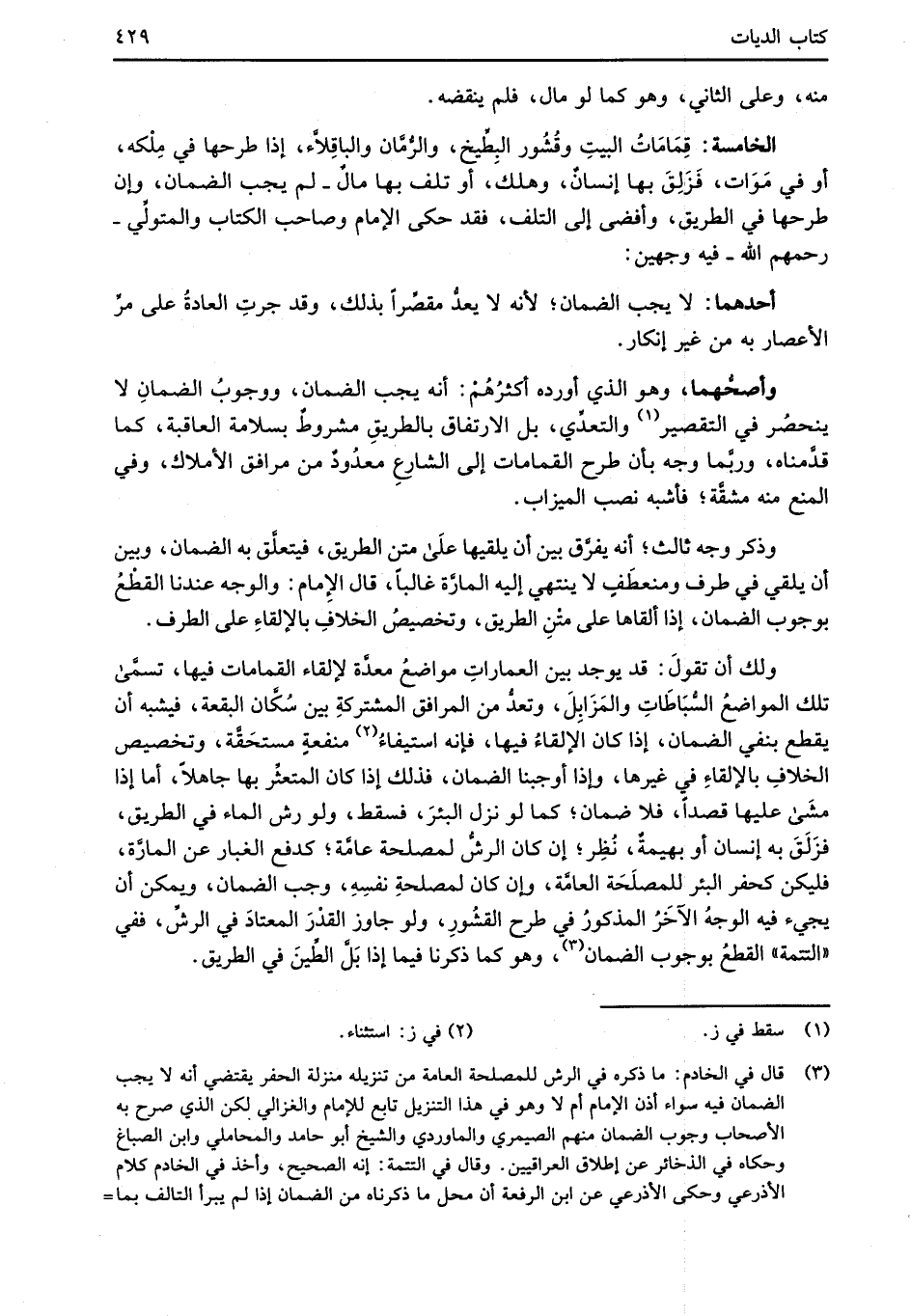 ولك أن تقولَ: قد يوجد بين العماراتِ مواضعُ معدَّة لإلقاء القمامات فيها، تسمَّى تلك المواضعُ السُّبَاطاتِ والمَزَابِلَ، وتعدُّ من المرافق المشتركةِ بين سُكَّان البقعة، فيشبه أن يقطع بنفي الضمان، إذا كان الإلقاءُ فيها، فإنه استيفاءُ (¬2) منفعةٍ مستحَقَّة، وتخصيص الخلافِ بالإلقاءِ في غيرها، وإذا أوجبنا الضمان، فذلك إذا كان المتعثِّر بها جاهلاً، أما إذا مشَى عليها قصدًا، فلا ضمان؛ كما لو نزل البئرَ، فسقط، ولو رش الماء في الطريق، فزَلَقَ به إنسان أو بهيمةٌ، نُظِر؛ إن كان الرشُّ لمصلحة عامَّة؛ كدفع الغبار عن المارَّة، فليكن كحفر البئر للمصلَحَة العامَّة، وإن كان لمصلحةِ نفسِهِ، وجب الضمان، ويمكن أن يجيء فيه الوجهُ الآخَرُ المذكورُ في طرح القشُورِ، ولو جاوز القدْرَ المعتادَ في الرشِّ، ففي "التتمة" القطعُ بوجوب الضمان (¬3)، وهو كما ذكرنا فيما إذا بَلَّ الطِّينَ في الطريق.