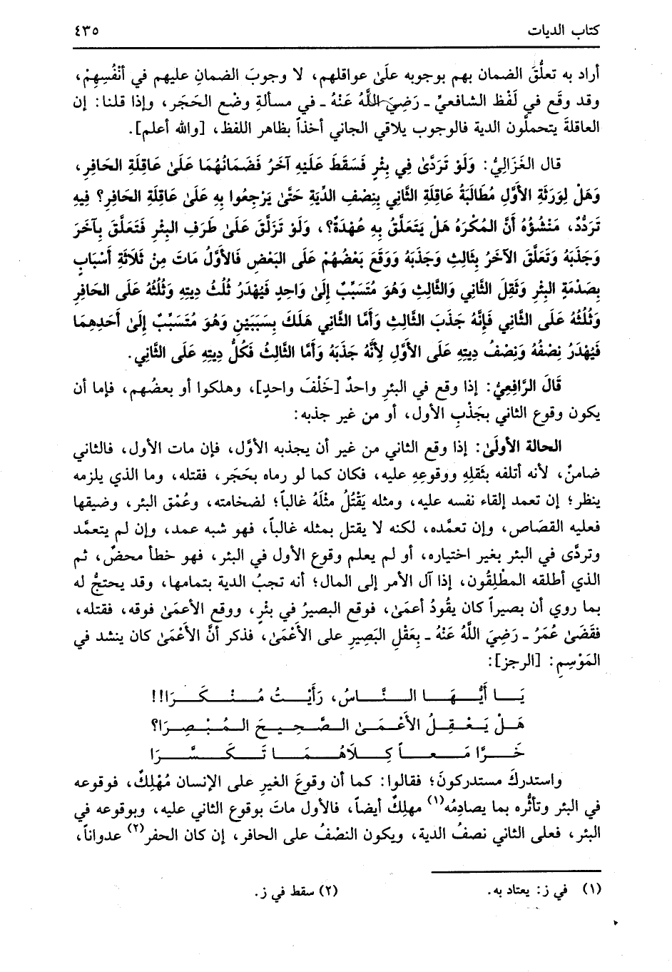 قال الغَزَالِيُّ: وَلَوْ تَرَدَّى فِي بِئْرٍ فَسَقَطَ عَلَيْهِ آخَرُ فَضَمَانُهُما عَلَى عَاقِلَةِ الحَافِرِ، وَهَلْ لِوَرَثَةِ الأَوَّلِ مُطَالَبَةُ عَاقِلَةِ الثَّانِي بِنِصْفِ الدِّيَةِ حَتَّى يَرْجِعُوا بِهِ عَلَى عَاقِلَةِ الحَافِرِ؟ فِيهِ تَرَدُّدٌ، مَنْشُؤُهُ أَنَّ المُكْرَهُ هَلْ يَتَعَلَّقُ بِهِ عُهْدَةٌ؟، وَلَوْ تَزَلَّقَ عَلَى طَرَفِ البِئْرِ فَتَعَلَّقَ بِآخَرَ وَجَذَبَهُ وَتَعَلَّقَ الآخَرُ بِثَالِثِ وَجَذَبَهُ وَوَقَعَ بَعْضُهُم عَلَى البَعْضِ فالأَوَّلُ مَاتَ مِنْ ثَلاَثَةِ أَسْبَابٍ بِصَدْمَة البِئْرِ وَثَقِلَ الثَّانِي والثَّالِثِ وَهُوَ مُتَسَبَّبٌ إَلَى وَاحِدٍ فَيُهْدَرُ ثُلُثُ دِيتِهِ وَثلُثُهُ عَلَى الحَافِرِ وَثُلُثُهُ عَلَى الثَّانِي فَإِنَّهُ جَذَبَ الثَّالِثِ وَأَمَّا الثَّانِي هَلَكَ بِسَبَبَيْنِ وَهُوَ مُتَسَبِّبٌ إِلَى أَحَدِهِمَا فَيُهْدَرُ نِصْفُهُ وَنِصْفُ دِيتِهِ عَلَى الأَوَّلِ لِأَنَّهُ جَذَبَهُ وَأَمَّا الثَّالِثُ فَكُلُّ دِيتِهِ عَلَى الثَّانِي.