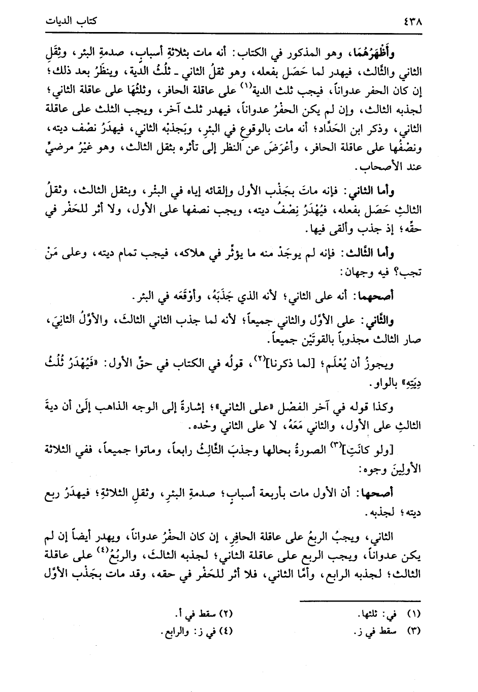 أصحها: أن الأول مات بأربعة أسبابٍ؛ صدمةِ البئرِ، وثقلِ الثلاثةِ؛ فيهدَرُ ربع ديته؛ لجذبه.
