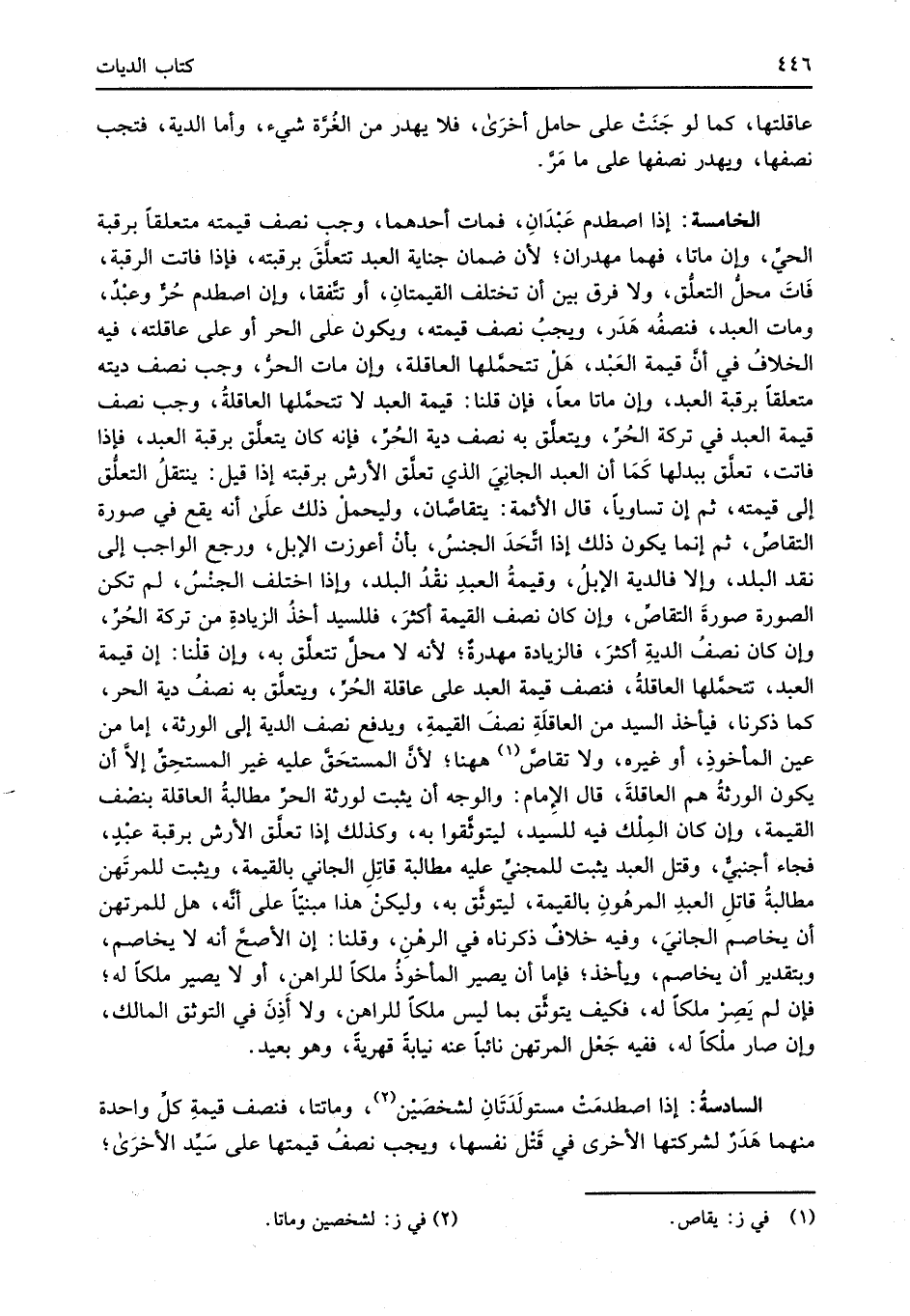 الخامسة: إذا اصطدم عَبْدَانِ، فمات أحدهما، وجب نصف قيمته متعلقاً برقبة الحيِّ، وإن ماتا، فهما مهدران؛ لأن ضمان جناية العبد تتعلَّقَ برقبته، فإذا فاتت الرقبة، فَاتَ محلُّ التعلُّق، ولا فرق بين أن تختلف القيمتانِ، أو تتَّفقا، وإن اصطدم حُرٌّ وعبْدٌ، ومات العبد، فنصفُه هَدَر، ويجبُ نصف قيمته، ويكون على الحر أو على عاقلته، فيه الخلافُ في أنَّ قيمة العَبْد، هَل تتحمَّلها العاقلة، وإن مات الحرُّ، وجب نصف ديته متعلقاً برقبة العبد، وإن ماتا معاً، فإن قلنا: قيمة العبد لا تتحمَّلها العاقلةُ، وجب نصف قيمة العبد في تركة الحُرِّ، ويتعلَّق به نصف دية الحُرِّ، فإنه كان يتعلَّق برقبة العبد، فإذا فاتت، تعلَّق ببدلها كَمَا أن العبد الجانِيَ الذي تعلَّق الأرش برقبته إذا قيل: ينتقلُ التعلُّق إلى قيمته، ثم إن تساويا، قال الأئمة: يتقاصَّان، وليحملْ ذلك عَلَى أنَّه يقع في صورة التقاصِّ، ثم إنما يكون ذلك إذا اتَّحَدَ الجنسُ، بأنْ أعوزت الإبل، ورجع الواجب إلى نقد البلد، وإلا فالدية الإبلُ، وقيمةُ العبدِ نقْدُ البلد، وإذا اختلف الجنْسُ، لم تكن الصورة صورةَ التقاصِّ، وإن كان نصف القيمة أكثرَ، فللسيد أخذُ الزيادةِ من تركة الحُرِّ، وإن كان نصفُ الديةِ أكثرَ، فالزيادة مهدرةٌ؛ لأنه لا محلَّ تتعلَّق به، وإن قلْنا: إن قيمة العبد، تتحمَّلها العاقلةُ، فنصف قيمة العبد على عاقلة الحُرِّ، ويتعلَّق به نصفُ دية الحر، كما ذكرنا، فيأخذ السيد من العاقلَةِ نصفَ القيمةِ، ويدفع نصف الدية إلى الورثة، إما من عين المأخوذِ، أو غيره، ولا تقاصَّ (¬1) ههنا؛ لأنَّ المستحَقَّ عليه غير المستحِقِّ إلاَّ أن يكون الورثةُ هم العاقلةَ، قال الإِمام: والوجه أن يثبت لورثة الحرِّ مطالبةُ العاقلة بنصْف القيمة، وإن كان المِلْك فيه للسيد، ليتوثَّقوا به، وكذلك إذا تعلَّق الأرش برقبة عبْدٍ، فجاء أجنبيٌّ، وقتل العبد يثبت للمجنيِّ عليه مطالبة قاتِلِ الجاني بالقيمة، ويثبت للمرتَهن مطالبةُ قاتلِ العبدِ المرهُونِ بالقيمة، ليتوثَّق به، وليكنْ هذا مبنيّاً على أنَّه، هل للمرتهن أن يخاصم الجانيَ، وفيه خلافٌ ذكرناه في الرهْنِ، وقلنا: إن الأصحَّ أنَّه لا يخاصم، وبتقدير أن يخاصم، ويأخذ؛ فأما أن يصير المأخوذُ ملكًا للراهن، أو لا يصير ملكًا له؛ فإن لم يَصِرْ ملكًا له، فكيف يتوثَّق بما ليس ملكًا للراهن، ولا أَذِنَ في التوثق المالك، وإن صار ملْكاً له، ففيه جَعْل المرتهن نائباً عنه نيابةً قهريةً، وهو بعيد.