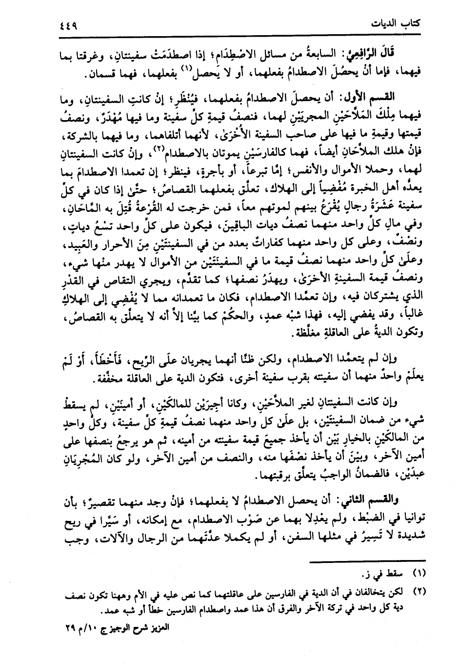 القسم الأول: أن يحصلَ الاصطدامُ بفعلهما، فيُنْظَر؛ إنْ كانت السفينتانِ، وما فيهما مِلْك المَلاَّحَيْنِ المجريَيْنِ لهما، فنصفُ قيمة كلِّ سفينة وما فيها مُهْدَرٌ، ونصفُ قيمتها وقيمةِ ما فيها على صاحب السفينة الأُخْرَى؛ لأنهما أتلفاهما، وما فيهما بالشركة، فإنْ هلك الملاَّحَانِ أيضاً، فهما كالفارسَيْنِ يموتان بالاصطدام (¬2)، وإنْ كانت السفينتانِ لهما، وحملا الأموال والأنفس؛ إمَّا تبرعاً، أو بأجرةٍ، فينظر؛ إن تعمدا الاصطدامَ بما يعدُّه أهل الخبرة مُفْضِياً إلى الهلاك، تعلَّق بفعلهما القصاصُ؛ حتَّى إذا كان في كلِّ سفينة عَشَرَةُ رجالٍ يُقْرَعُ بينهم لموتهم معاً، فمن خرجت له القُرْعةُ قُتِلَ به المَّلاحَانِ، وفي مالِ كلِّ واحد منهما نصفُ ديات الباقِينَ، فيكون على كلِّ واحد تسْعُ دياتٍ، ونصْفٌ، وعلى كل واحد منهما كفاراتٌ بعدد من في السفينَتَيْن مِن الأحرار والعَبِيد، وعلَى كلِّ واحد منهما نصفُ قيمة ما في السفينَتَيْن من الأموال لا يهدر منْها شيء، ونصفُ قيمة السفينة الأخرَى، ويهدَرُ نصفها؛ كما تقدَّم، ويجري التقاص في القدْرِ الذي يشتركان فيه، وإن تعمَّدا الاصطدام، فكان ما تعمدانه مما لا يُفْضِي إلى الهلاكِ غالباً، وقد يفضي إليه، فهذا شبْه عمدٍ، والحكُمْ كما بيَّنا إلاَّ أنَّه لا يتعلَّق به القصاصُ، وتكون الديةُ على العاقلةِ مغلَّظة.