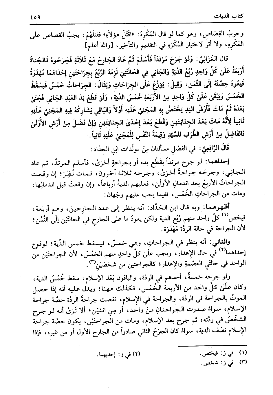 قال الغَزَالِيُّ: وَلَوْ جَرَحَ مُرْتَدَاً فَأَسْلَمَ ثُمَّ عَادَ الجَارحُ مَعَ ثَلاَثةٍ فَجَرَحُوهُ فَالجُنَاةُ أَرْبَعَةٌ عَلَى كُلِّ وَاحِدٍ رُبُعُ الدِّيَةِ وَالجَانِي فِي الحَالَتَيْنِ لَزِمَهُ الرُّبعُ بِجِرَاحَتَيْنِ إِحْدَاهُمَا مُهْدَرَةٌ فَيَعُودُ حِصَّتُهُ إِلَى الثَّمَن، وَقِيلَ: يُوَزَّعُ عَلَى الجِرَاحَاتِ وَيُقَالُ: الجِرَاحَاتُ خَمْسٌ فَيَسْقُطُ الخُمُسُ وَيَبْقَى عَلَى كُلِّ وَاحِدٍ مِنَ الأَرْبَعَةِ خُمُسُ الدِّيَةِ، وَلَوْ قَطَعَ يَدَ العَبْدِ الجَانِي فَجَنَى بَعْدَهُ ثُمَّ مَاتَ فَأرْشُ اليَدِ يَخْتَصُّ بِهِ المَجْنِيُّ عَلَيْهِ أَوَّلاً وَالبَاقِي يُشَارِكُهُ فِيهِ المَجْنِيُّ عَلَيْهِ ثَانِياً لِأَنَّهُ مَاتَ بَعْدَ الجِنَايَتَيْنِ وَقَطَعَ بَعْدَ إِحْدَى الجِنَايَتَيْنِ وَإنْ فَضَلَ مِنْ أَرْشِ الأُوْلَى فَالفَاضِلُ مِنْ أَرْشِ الطَّرَفِ للسَّيِّدِ وَقِيمَةُ النَّفْسِ لِلْمَجْنِيِّ عَلَيْهِ ثَانِياً.