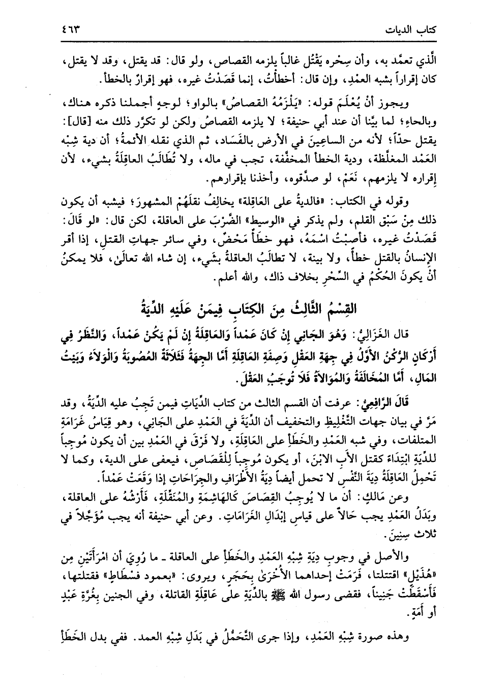 قَالَ الرَّافِعِيُّ: عرفت أن القسم الثالث من كتاب الدِّيَاتِ فيمن تَجِبُ عليه الدِّيَةُ، وقد مَرَّ في بيان جهات التَّغْلِيظِ والتخفيف أن الدِّيَةَ في العَمْدِ على الجَانِي، وهو قِيَاسُ غَرَامَةِ المتلفات، وفي شبه العَمْدِ والخَطَأ على العَاقِلَةِ، ولا فَرْقَ في العَمْدِ بين أن يكون مُوجِباً للدِّيَةِ ابْتِدَاءً كقتل الأَب الابْنَ، أو يكون مُوجباً لِلْقَصَاصِ، فيعفى على الدية، وكما لا تَحْمِلُ العَاقِلَةُ دِيَةَ النَّفْسِ لا تحمل أيضاً دِيَةُ الأطرَافِ والجِرَاحَاتِ إذا وَقَعَتْ عَمداً.