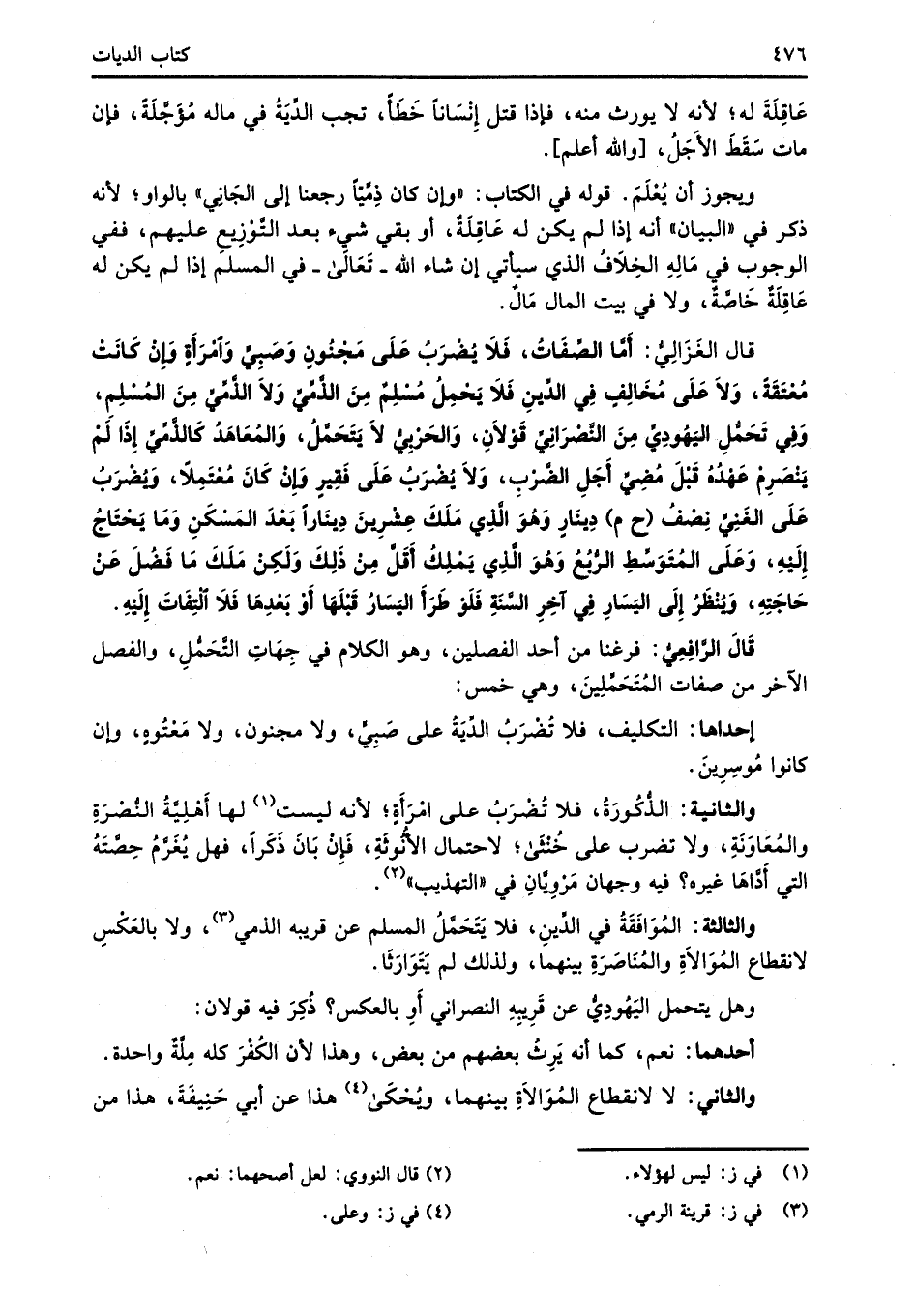 والثالثة: المُوَافَقَةُ في الدِّينِ، فلا يَتَحَمَّلُ المسلم عن قريبه الذمي (¬3)، ولا بالعَكْسِ لانقطاع المُوَالاَة والمُنَاصَرَةِ بينهما، ولذلك لم يَتَوَارَثَا.