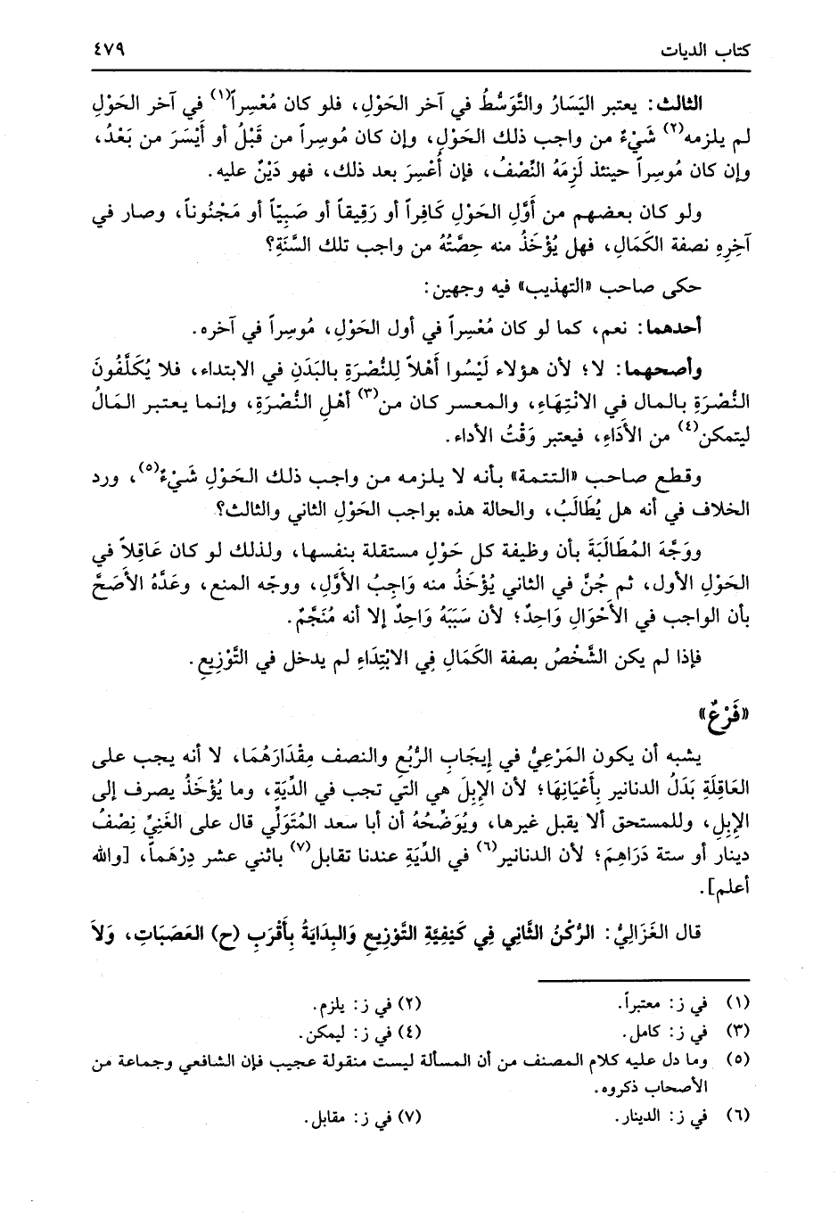 الثالث: يعتبر اليَسَارُ والتَّوَسُّطُ في آخر الحَوْلِ، فلو كان مُعْسِراً (¬1) في آخر الحَوْلِ لم يلزمه (¬2) شَيْءٌ من واجب ذلك الحَوْلِ، وإن كان مُوسِراً من قَبْلُ أو أَيْسَرَ من بَعْدُ، وإن كان مُوسِراً حينئذ لَزِمَة النِّصْفُ، فإن أُعْسِرَ بعد ذلك، فهو دَيْنٌ عليه.