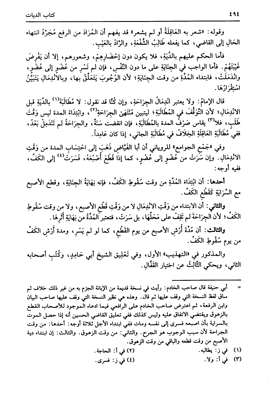 = أبي حنيفة قال صاحب الخادم: رأيت في نسخة قديمة من الإبانة الجزم به من غير ذلك خلاف ثم ساق لفظ النسخة التي وقف عليها ثم قال. وهذه هي نظير النسخة التي وقف عليها صاحب البيان وابن الرفعة، ثم اعترض صاحب الخادم على الرافعي فيما ادعاه الموجود للأصحاب القطع بالزهوق ويقتضي الاتفاق عليه وليس كذلك ففي تعليق القاضي الحسين أن إذا حصل الموت بالسراية بأن اصبعه فسرى إلى نفسه ومات ففي ابتداء الأجل ثلاثة أوجه: أحدها: من وقت الجراحة لأن سبب الوجوب هو الجرح. والثاني: من وقت الزهوق. والثالث: إن ابتداء دية الأصبع من وقت قطعه والباقي من وقت الزهوق.