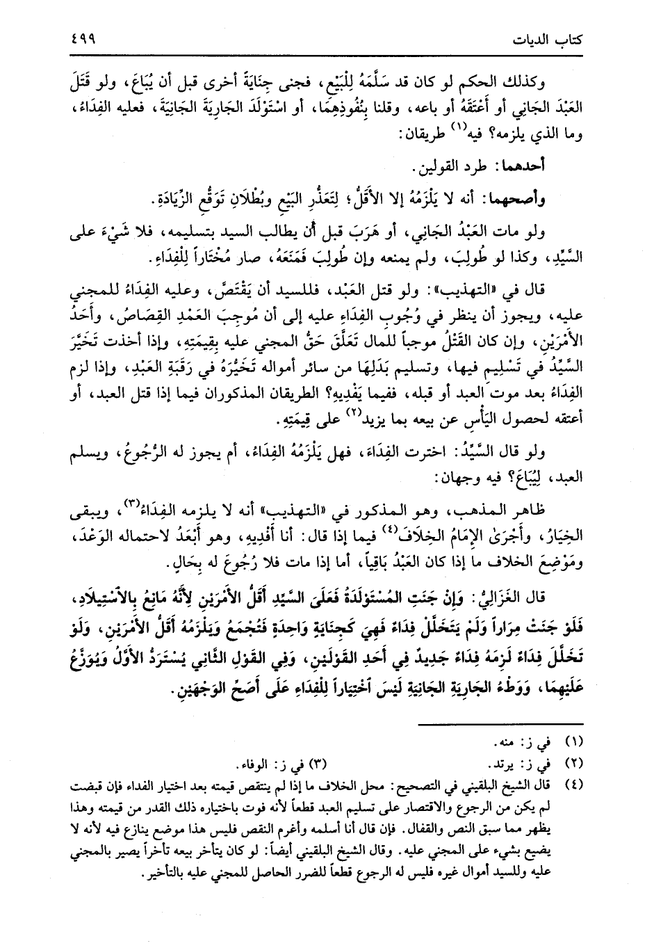 (¬4) قال الشيخ البلقيني في التصحيح: محل الخلاف ما إذا لم ينتقص قيمته بعد اختيار الفداء فإن قبضت لم يكن من الرجوع والاقتصار على تسليم العبد قطعاً لأنه فوت باختياره ذلك القدر من قيمته وهذا يظهر مما سبق النص والقفال. فإن قال أنا أسلمه وأغرم النقص فليس هذا موضع ينازع فيه لأنه لا يضيع بشيء على المجني عليه. وقال الشيخ البلقيني أيضاً: لو كان يتأخر بيعه تأخراً يصير بالمجني عليه وللسيد أموال غيره فيس له الرجوع قطعاً للضرر الحاصل للمجني عليه بالتأخير.