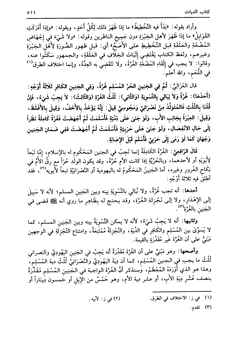 قَالَ الرَّافِعِيُّ: الغُرَّةُ الكَامِلَةُ إنما تَجِبُ في الجنين المَحْكُوم له بالإِسلام، إِمَّا تَبَعاً لأَبوَيْهِ أو لأحدهما، وبالحُرَّيَّةِ إذا كانت الأم حُرَّةً، وقد يكون الولَد حُرّاً مع رِقِّ الأُمِّ في نِكَاح الغُرورِ وغيره، أما الجَنِينُ المَحْكُومُ له باليهودية أو النَّصْرَانِيَّةِ تبعاً لأبويه (¬2)، فقد أطلق فيه ثلاثة أَوْجُهٍ: