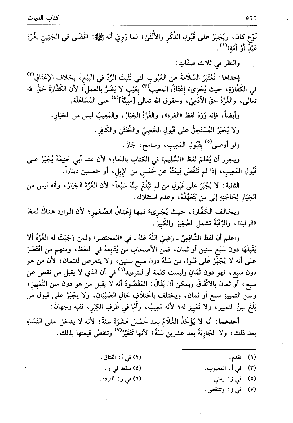 ويجوز أن يُعْلَمَ لفظ "السَّلِيم" فيِ الكتاب بالحَاءِ؛ لأن عند أبي حَنِيْفَةَ يُجْبَرُ على قُبُولِ المَعِيبِ، إذا لم تَنْقُصْ قِيمَتُهُ عن خَمْسٍ من الإِبِلِ، أو خمسين دينارًا.