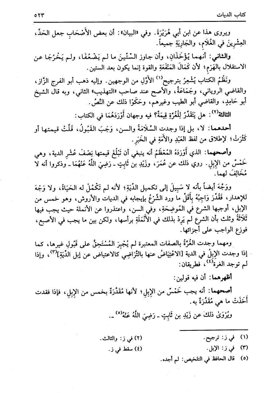 وأصحهما: الذي أَورَدَهُ المُعْظَمُ أنه ينبغي أن تَبْلُغَ قيمتها نِصْفَ عُشْرِ الدية، وهي خَمْسٌ من الإبِلِ. روي ذلك عن عُمَرَ، وزَيْدِ بن ثابتٍ -رَضِيَ اللهُ عَنْهُمَا- وذكروا أنه لا مُخَالِفَ لهما.