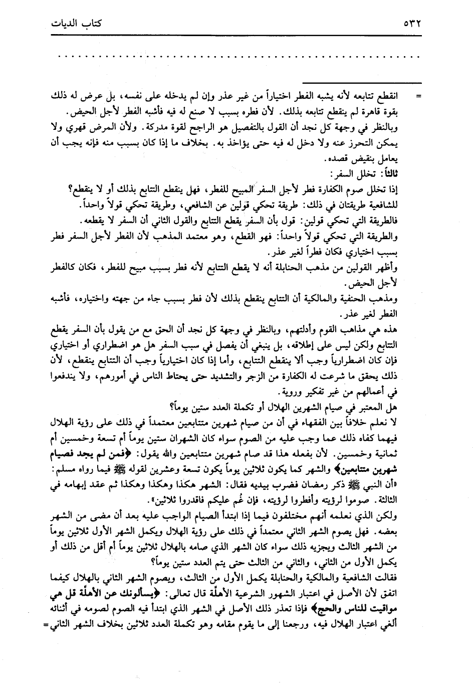 هذه هي مذاهب القوم وأدلتهم، وبالنظر في وجهة كل نجد أن الحق مع من يقول بأن السفر يقطع التتابع ولكن ليس على إطلاقه، بل ينبغي أن يفصل في سبب السفر هل هو اضطراري أو اختياري فإن كان اضطراريًا وجب ألا ينقطع التتابع، وأما إذا كان اختياريًا وجب أن التتابع ينقطع؛ لأن ذلك يحقق ما شرعت له الكفَّارة من الزجر والتشديد حتى يحتاط الناس في أمورهم، ولا يندفعوا في أعمالهم من غير تفكير وروية.