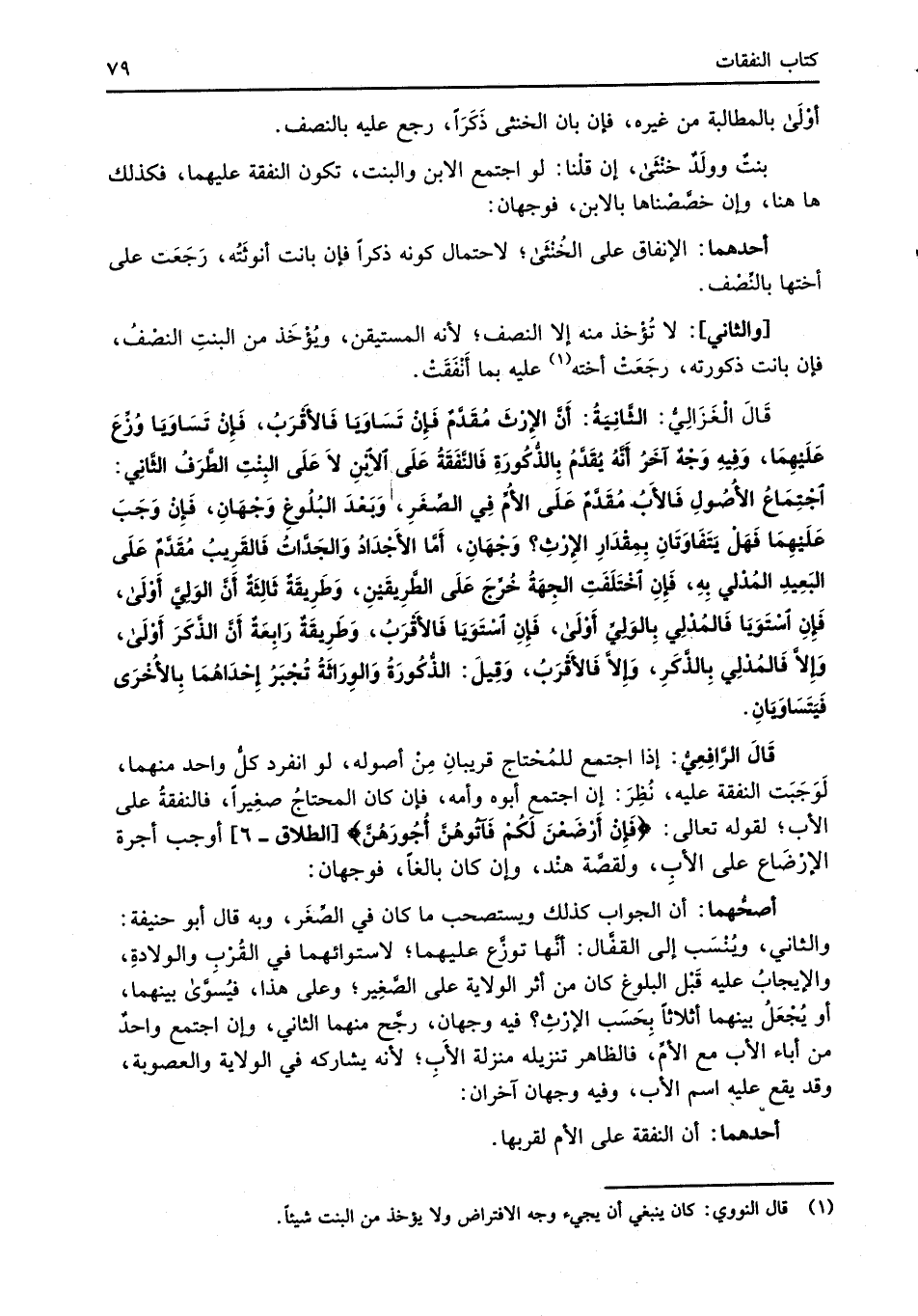 قَالَ الْغَزَالِيُّ: الثَّانِيَةُ: أَنَّ الإِرْثَ مُقَدَّمٌ فَإنْ تَسَاوَيَا فَالأَقْرَبُ، فَإنْ تَسَاوَيَا وُزِّعَ عَلَيْهِمَا، وَفِيهِ وَجْهٌ آخَرُ أنَّهُ يُقَدَّمُ بِالذُّكُورَةِ فَالنَّفَقَةُ عَلَى الابْنِ لاَ عَلَى البِنْتِ الطَّرَفُ الثَّانِي: اجْتِمَاعُ الأصُولِ فَالأَبُ مُقَدَّمٌ عَلَى الأُمِّ فِي الصِّغَرِ، وبَعْدَ البُلُوغِ وَجْهَانِ، فَإِنْ وَجَبَ عَلَيْهِمَا فَهَلْ يَتَفَاوَتَانِ بِمِقْدَارِ الإِرْثِ؟ وَجْهَانِ، أَمَّا الأَجْدَادُ وَالجَدَّاتُ فَالقَرِيبُ مُقَدَّمٌ عَلَى البَعِيدِ المُدْلي بِهِ، فَإنِ اخْتَلَفَتِ الجِهَةُ خُرِّجَ عَلَى الطَّرِيقَيْنِ، وَطَرِيقَةٌ ثَالِثَةٌ أَنَّ الوَلِيَّ أَوْلَى، فَإنِ اسْتَوَيَا فَالمُدْلِي بِالوَلِيِّ أَوْلَى، فَإنِ اسْتَوَيَا فَالأَقْرَبُ، وَطَرِيقَةٌ رَابِعْةٌ أَنَّ الذَّكرَ أَوْلَى، وَإِلاَّ فَالمُدْلِي بِالذَّكَرِ، وَإِلاَّ فَالأَقْرَبُ، وَقِيلَ: الذُّكُورَةُ وَالوِرَاَثَةُ تُجْبَرُ إِحْدَاهُمَا بِالأُخْرَى فَيَتَسَاوَيَانِ.
