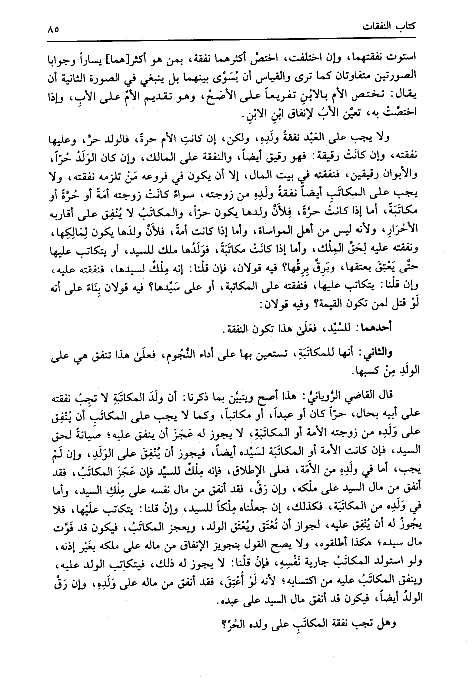 ولا يجب على العَبْد نفقةُ ولَدِهِ، ولكن، إن كانتِ الأم حرةً، فالولد حرٌّ، وعليها نفقته، وإن كانَتْ رقيقة: فهو رقيق أيضاً، والنفقة على المالك، وإن كان الوَلَدُ حُرّاً، والأبوان رقيقين، فنفقته في بيت المال، إلا أن يكون في فروعه مَنْ تلزمه نفقته، ولا يجب على المكاتَبِ أيضاً نفقةُ ولَدِهِ من زوجته، سواءٌ كانَتْ زوجته أمَةً أو حُرَّةً أو مكاتَبَةً، أمَّا إذا كانتْ حرَّةً، فِلأنَّ ولدها يكون حرّاً، والمكاتَبُ لا يُنْفِق على أقاربه الأحْرَارِ، ولأنه ليس من أهل المواساة، وأما إذا كانت أمةً، فلأَنَّ ولدَها يكون لِمَالِكِها، ونفقته عليه لِحَقِّ المِلْك، وأما إذا كانَتْ مكاتَبَةً، فوَلَدُها ملك للسيد، أو يتكاتب عليها حتَّى يَعْتِقَ بعتقها، وَيرِقَّ بِرِقِّها؟ فيه قولان، فإن قلْنا: إنه مِلْكٌ لسيدها، فنفقته عليه، وإن قلْنا: يتكاتب عليها، فنفقته على المكاتبة، أو على سَيِّدها؟ فيه قولان بِنَاءً على أنه لَوْ قبْل لمن تكون القيمة؟ وفيه قولان: