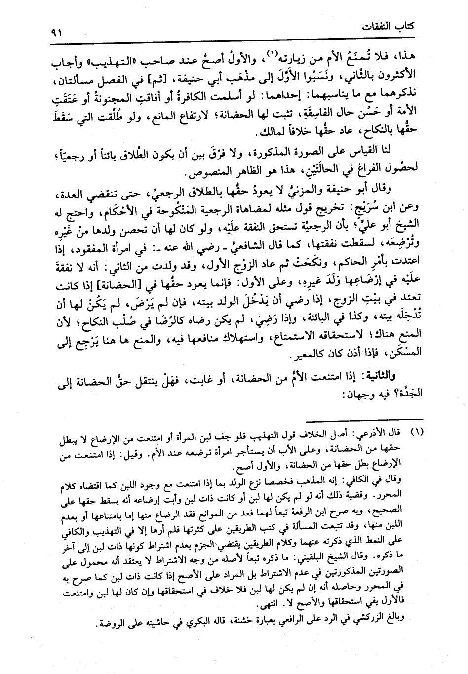 وقال أبو حنيفة والمزنيُّ لا يعودُ حقُّها بالطلاق الرجعيِّ، حتى تنقضي العدة، وعن ابن سُرَيْج: تخريج قول مثله لمضاهاة الرجعية المَنْكُوحة في الأحْكَام، واحتج له الشيخ أبو عليٍّ، بأن الرجعيَّة تستحق النفقة علَيْه، ولو كان لها أن تحصن ولدها منْ غَيْرِه وتُرْضِعَه، لسقطت نفقتها، كما قال الشافعيُّ -رضي الله عنه-: في امرأة المفقود، إذا اعتدت بأمْرِ الحاكم، ونكَحَتْ ثم عاد الزوْج الأول، وقد ولدت من الثاني: أنه لا نفقةَ علَيْه في إرْضَاعِها وَلَدَ غيرِهِ، وعلى الأول: فإنما يعود حقُّها في [الحضانة] إذا كانت تعتد في بيْتِ الزوج، إذا رضي أن يَدْخُلَ الولد بيته، فإن لم يَرْضَ، لم يَكُنْ لها أن تُدْخِلَه بيته، وكذا في البائنة، وإذا رَضِيَ، لم يكن رضاه كالرِّضَا في صُلْب النكاح؛ لأن المنع هناك؛ لاستحقاقه الاستمتاع، واستهلاك منافعها فيه، والمنع هاهنا يَرْجع إلى المسْكَن، فإذا أذن كان كالمعير.