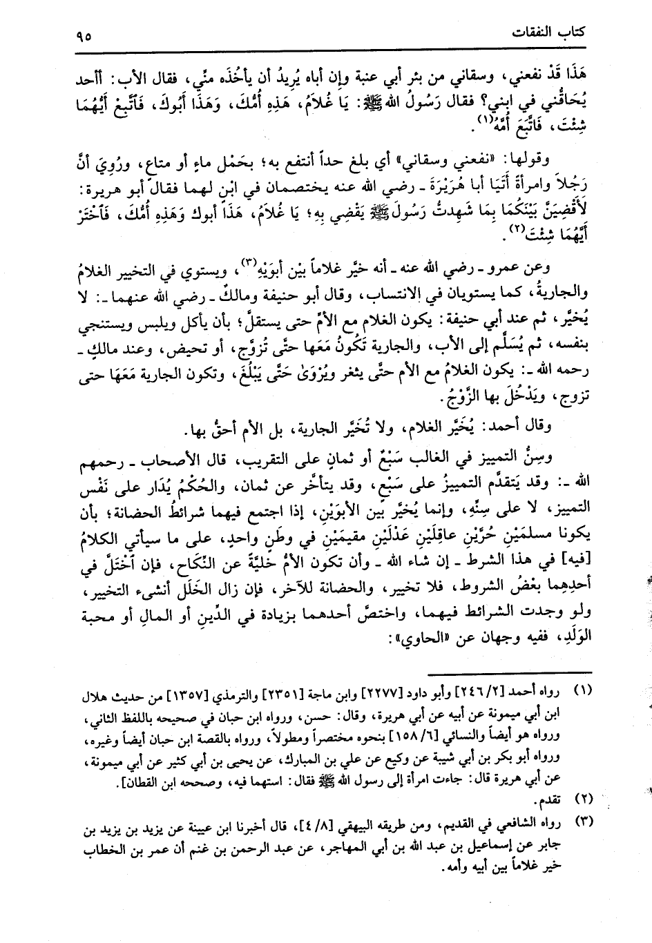 هَذَا قَدْ نفعني، وسقاني من بئر أبي عنبة وإِن أباه يُرِيدُ أن يأخُذَه منِّي، فقال الأب: أأحد يُحَاقُّني في ابني؟ فقال رَسُولُ الله -صلى الله عليه وسلم-: يَا غُلاَمُ، هَذِهِ أُمُّكَ، وَهَذَا أَبُوكَ، فَاتَّبعْ أيُّهُمَا شِئْتَ، فَاتَّبَعَ أُمَّهُ (¬1).