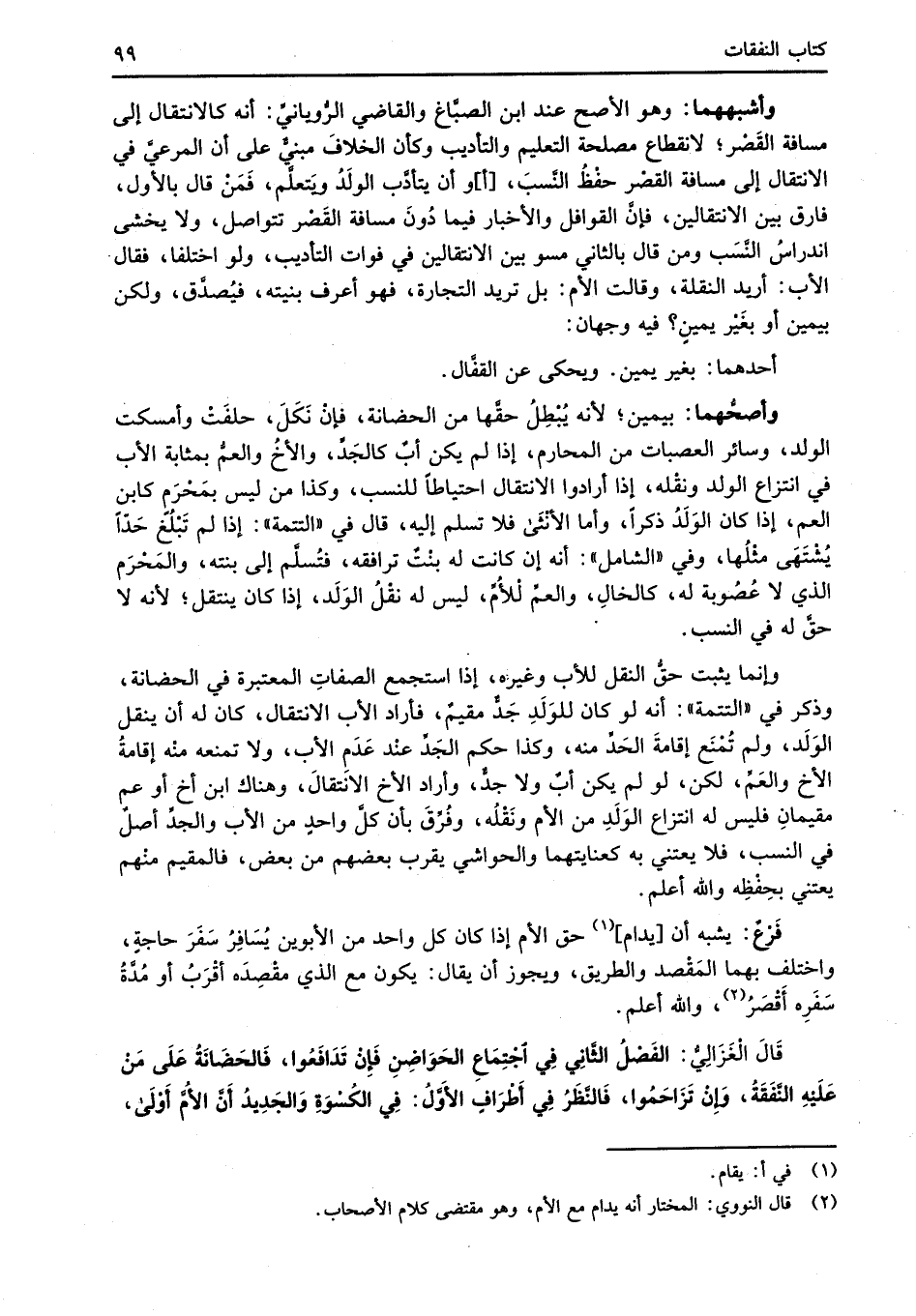 وأصحُّهما: بيمين؛ لأنه يُبْطِلُ حقِّها من الحضانة، فإنْ نَكَلَ، حلفَتْ وأمسكت الولد، وسائر العصبات من المحارم، إذا لم يكن أبٌ كالجَدِّ، والأخُ والعمُّ بمثابة الأب في انتزاع الولد ونقْله، إذا أرادوا الانتقال احتياطاً للنسب، وكذا من ليس بمَحْرَمٍ كابن العم، إذا كان الوَلَدُ ذكراً، وأما الأنْثَى فلا تسلم إليه، قال في "التتمة": إذا لم تَبْلُغ حَدّاً يُشْتَهَى مثلُها، وفي "الشامل": أنه إن كانت له بنْتٌ ترافقه، فتُسلَّم إلى بنته، والمَحْرَم الذي لا عُصُوبة له، كالخالِ، والعمِّ لْلأُمً، ليس له نقْلُ الوَلَد، إذا كان ينتقل؛ لأنه لا حقَّ له في النسب.