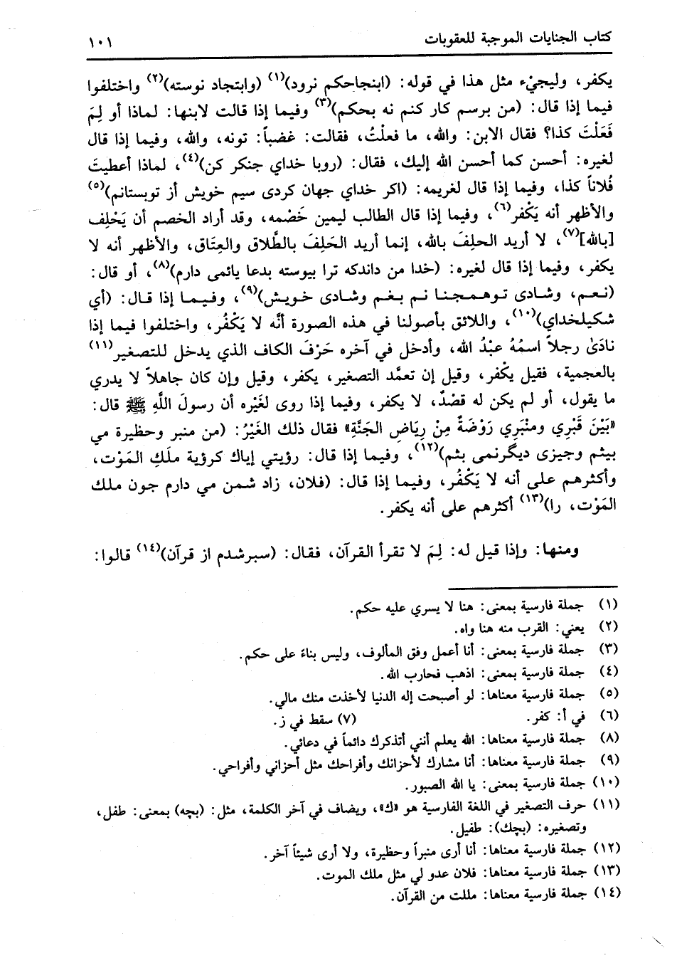 يكفر، وليجيْء مثل هذا في قوله: (ابنجاحكم نرود) (¬1) (وابتجاد نوسته) (¬2) واختلفوا فيما إذا قال: (من برسم كار كنم نه بحكم) (¬3) وفيما إذا قالت لابنها: لماذا أو لِمَ فَعَلْتَ كذا؟ فقال الابن: والله، ما فعلْتُ، فقالت: غضباً: تونه، والله، وفيما إذا قال لغيره: أحسن كما أحسن الله إليك، فقال: (روبا خداي جنكر كن) (¬4)، لماذا أعطيتَ فُلاناً كذا، وفيما إذا قال لغريمه: (اكر خداي جهان كردى مميم خويش أز توبستانم) (¬5) والأظهر أنه يَكْفر (¬6)، وفيما إذا قال الطالب ليمين خَصْمه، وقد أراد الخصم أن يَحْلِف [بالله] (¬7)، لا أريد الحلِفَ بالله، إنما أريد الحَلِفَ بالطَّلاق والعِتَاق، والأظهر أنه لا يكفر، وفيما إذا قال لغيره: (خدا من داندكه ترا بيوسته بدعا يائمى دارم) (¬8)، أو قال: (نعم، وشادى توهمجنا ثم بغم وشادى خويش) (¬9)، وفيما إذا قال: (أي شكيلخداي) (¬10)، واللائق بأصولنا في هذه الصورة أنَّه لا يَكْفُر، واختلفوا فيما إذا نادَى رجلاً اسمُهُ عبْدُ الله، وأدخل في آخره حَرْفَ الكاف الذي يدخل للتصغير (¬11) بالعجمية، فقيل يكْفر، وقيل إن تعمَّد التصغير، يكفر، وقيل وإن كان جاهلًا لا يدري ما يقول، أو لم يكن له قصْدٌ، لا يكفر، وفيما إذا روى لغَيْره أن رسولَ اللهِ -صلى الله عليه وسلم- قال "بَيْنَ قَبْرِي ومنْبَرِي رَوْضَةٌ مِنْ رِيَاضِ الجَنَّةِ" فقال ذلك الغَيْرُ: (من منبر وحظيرة في بيثم وجيزى ديكَرنمى بثم) (¬12)، وفيما إذا قال: رؤيتي إياك كرؤية ملَكِ المَوْت، وأكثرهم على أنه لا يَكْفُر، وفيما إذا قال: (فلان، زاد شمن في دارم جون ملك المَوْت، را) (¬13) أكثرهم على أنه يكفر.
