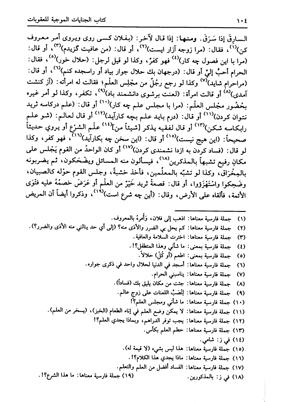 السارِقَ إذا سَرَقَ. ومنها: إذا قال لآخر: (بفلان كسى روى ويروى أمر معروف كن) (¬1)، فقال: (مرا زوجه آزار ايست) (¬2)، أو قال: (من عافيت كَزيدم) (¬3)، أو قال: (مرا با اين فصول جه كار) (¬4) فهو كفرٌ، وكذا لو قيل لرجل: (حلال خور) (¬5)، فقال: الحرام أحبُّ إليَّ أو قال: (درجهان بك حلال جوار بياد أو راسجده كنم) (¬6)، أو قال: (مراحرام شايد) (¬7) وكذا لو رجع رجُلٌ من مجْلِس العلْم؛ فقالت له امرأته: (آز كنشت آمدى) (¬8) أو قالت امرأة: (لعنت برشوى دانشمند باد) (¬9)، تكفر، وكذا لو أمر غيره بحُضُور مجْلس العلْم: (مرا با مجلس علم جه كار) (¬10) أو قال: (علم دركاسه ثريد نتوان كردن) (¬11) أو قال: (درم بايد علم بجه كارآيد) (¬12) أو قال لعالم: (شو علم رابكاسه شكن) (¬13) أو قال لفقيه يذكر [شيئاً من] (¬14) علْم الشرْع أو يروي حديثاً صحيحاً: (اين هيج نيست) (¬15) أو قال: (اين سخن جه بكارآيد) (¬16)، فهو كفر، وكذا لو قال: (فساد كردن به ازدا نشمندى كردن) (¬17) أو كان الواحدُ من القوم يَجْلس على مكانِ رفيع تشبهاً بالمذكرين (¬18)، فيسألون منه المسائل ويضْحَكون، ثم يضربونه بالمِخْرَاق، وكذا لو تشبَّه بالمعلِّمين، فأخذ خشبةً، وجلس القوم حوْله كالصبيان، وضَحِكوا واسْتَهْزَؤوا، أو قال: قصعةُ ثريد خَيْرٌ من العلْم أو عَرَضَ خصمُهُ عليه فتْوَى الأئمة، فألقاه على الأرض، وقال: (أين جه شرع است) (¬19)، وذكروا أيضاً أن المريض