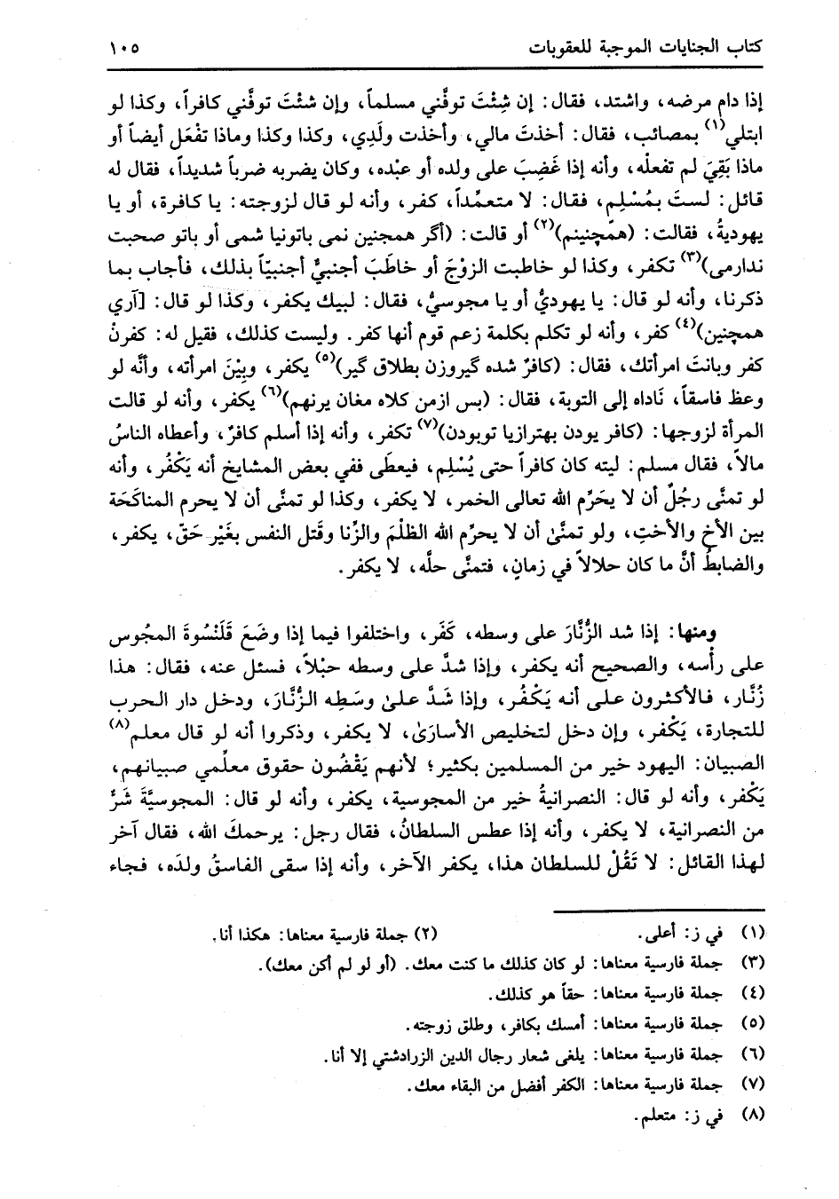 إذا دام مرضه، واشتد، فقال: إن شِئْتَ توفَّني مسلماً، وإن شئْتَ توفَّني كافراً، وكذا لو ابتلي (¬1) بمصائب، فقال: أخذتَ مالي، وأخذت ولَدِي، وكذا وكذا وماذا تفْعَل أيضاً أو ماذا بَقِيَ لم تفعلْه، وأنه إذا غَضِبَ على ولده أو عبْده، وكان يضربه ضرباً شديداً، فقال له قائل: لستَ بمُسْلِمٍ، فقال: لا متعمِّداً، كفر، وأنه لو قال لزوجته: يا كافرة، أو يا يهوديةُ، فقالت: (همجنينم) (¬2) أو قالت: (أكَر همجنين نمى باتونيا شمى أو باتو صحبت ندارمى) (¬3) تكفر، وكذا لو خاطبت الزوْجَ أو خاطَبَ أجنبيٌّ أجنبيّاً بذلك، فأجاب بما ذكرنا، وأنه لو قال: يا يهوديُّ أو يا مجوسيُّ، فقال: لبيك يكفر، وكذا لو قال: [آري همجنين] (¬4) كفر، وأنه لو تكلم بكلمة زعم قوم أنها كفر. وليست كذلك، فقيل له: كفرنْ كفر وبانتَ امرأتك، فقال: (كافرٌ سنده كَيروزن بطلاق كَير) (¬5) يكفر، وبِيْنَ امرأته، وأنَّه لو وعظ فاسقاً، نَاداه إلى التوبة، فقال: (بس ازمن كلاه مغان يرنهم) (¬6) يكفر، وأنه لو قالت المرأة لزوجها: (كافر يودن بهترازيا توبودن) (¬7) تكفر، وأنه إذا أسلم كافرٌ، وأعطاه الناسُ مالاً، فقال مسلم: ليته كان كافراً حتى يُسْلِم، فيعطَى ففي بعض المشايخ أنه يَكْفُر، وأنه لو تمنَّى رجُلٌ أن لا يحَرِّم الله تعالى الخمر، لا يكفر، وكذا لو تمنَّى أن لا يحرم المناكَحَة بين الأخِ والأختِ، ولو تمنَّى أن لا يحرِّم الله الظلْمَ والزِّنا وقَتل النفس بغَيْر حَقّ، يكفر، والضابطُ أنَّ ما كان حلالاً في زمانٍ، فتمنَّى حلَّه، لا يكفر.