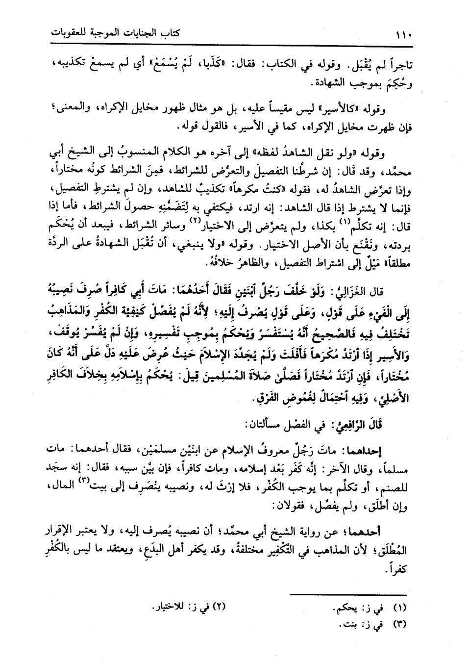 قال الغَزَالِيُّ: وَلَوْ خَلَّفَ رَجُلٌ ابْنَيْنِ فَقَالَ أَحَدُهُمَا: مَاتَ أَبِي كَافِراً صُرِفَ نَصِيبُهُ إِلَى الْفَيْءِ عَلَى قَوْلٍ، وَعَلَى قَوْلٍ يُصْرفُ إِلَيْهِ؛ لِأَنَّهُ لَمْ يُفَصِّلْ كَيْفِيَّة الكُفْرِ وَالمَذَاهِبُ تَخْتَلِفُ فِيهِ فَالصَّحِيحُ أَنَّهُ يُسْتَفْسَرُ وَيُحْكَمُ بِمُوجِبِ تَفْسِيرِهِ، وَإِنْ لَمْ يُفْسِّرْ يُوقَفْ، وَالأَسِير إِذَا ارْتَدَّ مُكْرَهاً فَأَفْلَتَ وَلَمْ يُجَدِّدَ الإِسْلاَمَ حَيْثُ عُرِضَ عَلَيْهِ دَلَّ عَلَى أَنَّهُ كَانَ مُخْتَاراً، فَإِنِ ارْتَدَّ مُخْتَاراً فَصَلَّى صَلاَة المُسْلِمينَ قِيلَ: يُحْكَمُ بِإِسْلاَمِهِ بِخِلاَفَ الكَافِرِ الأَصْلِيِّ، وَفِيهِ احْتِمَالٌ لِغُمُوضِ الفَرْقِ.