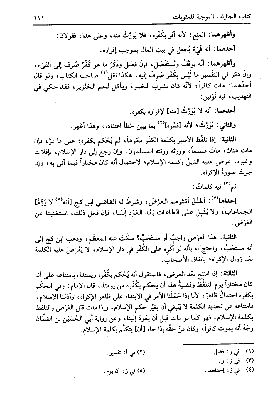 الثانية: إذا تلفَّظ الأسير بكلمة الكفْر مكرهاً، لم يُحْكم بكفره؛ على ما مرَّ، فإن مات هناك، ماتَ مسلماً، وورثه ورثته المسلمون، وإن رجع إلى دار الإسلام، بإفلات وغيره، عرض عليه الدينُ وكلمة الإسلام؛ لاحتمال أنه كان مختاراً فيما أتى به، وإن جرتْ صورةُ الإكراه.