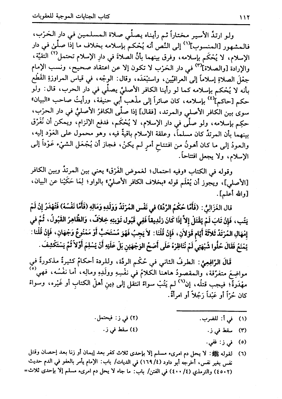 (¬6) لقوله -صلى الله عليه وسلم-: لا يحل دم امرئ مسلم إلا بإحدى ثلاث كفر بعد إيمان أو زنا بعد إحصان وقتل نفس بغير نفس، أخرجه أبو داود (4/ 169) في الديات/ باب: الإِمام يأمر بالعفو في الدم حديث (4502) والترمذي (4/ 400) في الفتن/ باب: ما جاء لا يحل دم امرئ مسلم إلا بإحدى ثلاث =