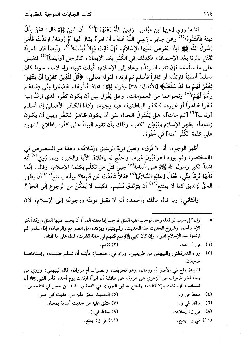 = وإن كل سبب لو فعله رجل لوجب عليه القتل فوجب إذا فعلته المرأة أن يجب عيها القتل، وقد أنكر الإِمام أحمد وشيوخ الحديث هذا الحديث، ولم يثبتوه ويؤكده أهل الصوامع والرهبان، إذا أسلموا ثم ارتدوا بعد الإسلام قتلوا، وإن كان النبي -صلى الله عليه وسلم- منع قتلهم في حالة الشرك، فدل على ما قلناه.