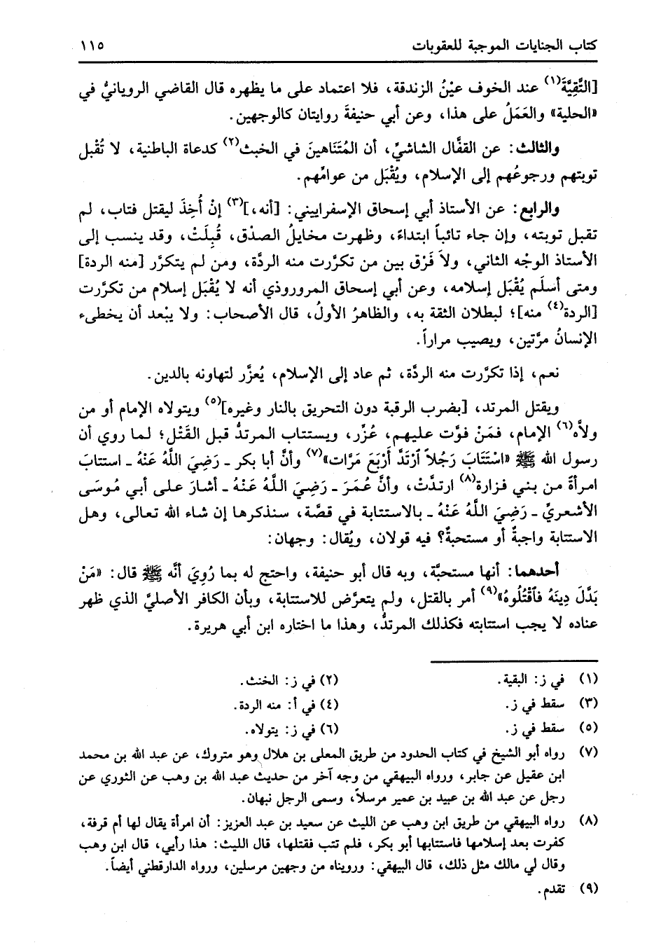 ويقتل المرتد، [بضرب الرقبة دون التحريق بالنار وغيره] (¬5) ويتولاه الإِمام أو من ولاَّه (¬6) الإِمام، فمَنْ فوَّت عليهم، عُزِّر، ويستتاب المرتدُّ قبل القَتْل؛ لما روي أن رسول الله -صلى الله عليه وسلم- "اسْتَتَابَ رَجُلاً ارْتَدَّ أَرْبَعَ مَرَّات" (¬7) وأنَّ أبا بكر -رَضِيَ اللهُ عَنْهُ- استتابَ امرأةً من بني فزارة (¬8) ارتدَّتْ، وأنَّ عُمَرَ -رَضِيَ الله عَنْهُ- أشارَ على أبي مُوسَى الأشعريِّ -رَضِيَ اللهُ عَنْهُ- بالاستتابة في قصَّة، سنذكرها إن شاء الله تعالى، وهل الاستتابة واجبةٌ أو مستحبةٌ؟ فيه قولان، ويُقال: وجهان: