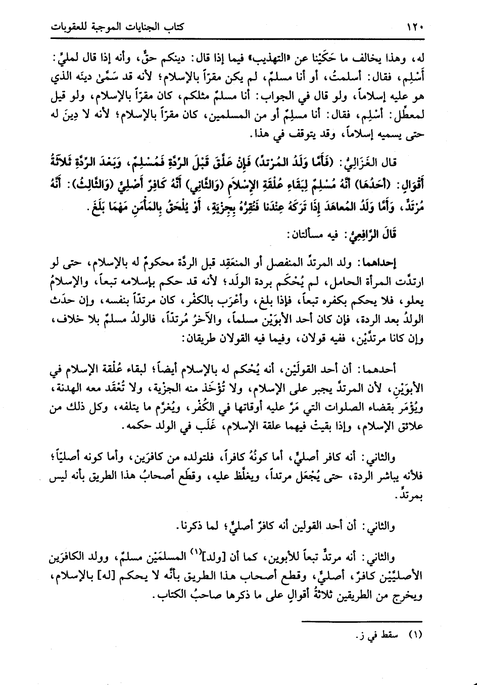 قال الغَزَالِيُّ: (فأَمَّا وَلَدُ المُرْتدِّ) فَإِنْ عَلَّقَ قَبْلَ الرِّدَّةِ فَمُسْلِمٌ، وَبَعْدَ الرِّدَّةِ ثَلَاثَةُ أَقْوَالٍ: (أحَدُهَا) أنَّهُ مُسْلِمٌ لِبَقَاءِ عُلْقَةِ الإِسْلاَمِ (وَالثَّانِي) أنَّهُ كَافِرٌ أَصْلِيٌّ (وَالثَّالِثُ): أَنَّهُ مُرْتَدٌّ، وَأَمَّا وَلَدُ المُعاهَدَ إِذَا تَرَكَهُ عِنْدَنَا فَنُقِرُّهُ بِجِزْيَةٍ، أَوْ يُلْحَقُ بِالمَأْمَنِ مَهْمَا بَلَغَ.