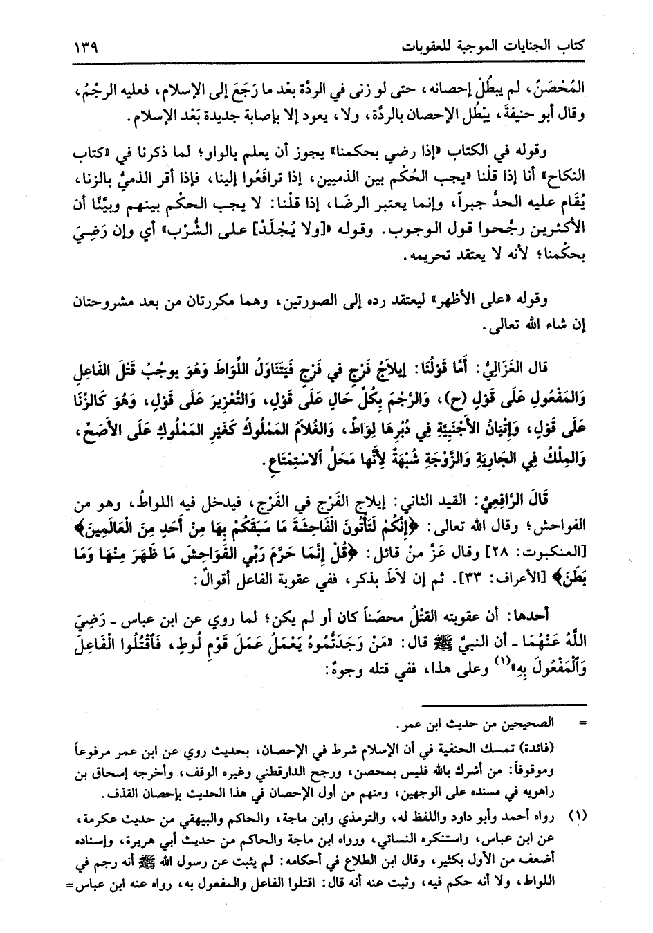 قَالَ الرَّافِعِيُّ: القيد الثاني: إيلاج الفَرْج في الفَرْج، فيدخل فيه اللواطُ، وهو من الفواحش؛ وقال الله تعالى: {إِنَّكُمْ لَتَأْتُونَ الْفَاحِشَةَ مَا سَبَقَكُمْ بِهَا مِنْ أَحَدٍ مِنَ الْعَالَمِينَ} [العنكبوت: 28] وقال عَزَّ منْ قائل: {قُلْ إِنَّمَا حَرَّمَ رَبِّيَ الْفَوَاحِشَ مَا ظَهَرَ مِنْهَا وَمَا بَطَنَ} [الأعراف: 33]. ثم إن لاَطَ بذكر، ففي عقوبة الفاعل أقوالٌ:
