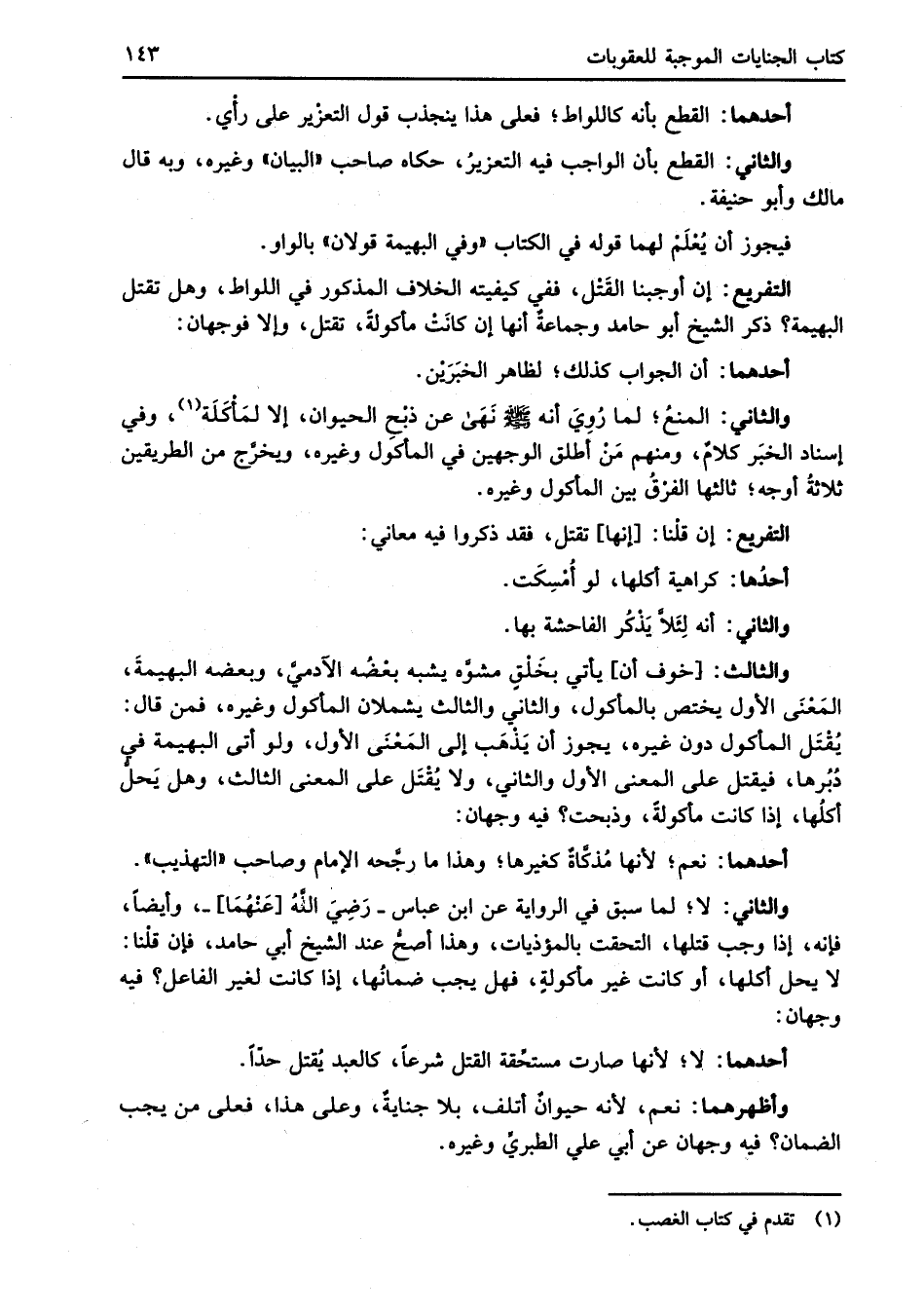 والثالث: [خوف أن] يأتي بخَلْقِ مشوَّه يشبه بعْضُه الآدميَّ، وبعضه البهيمةَ، المَعْنَى الأول يختص بالمأكول، والثاني والثالث يشملان المأكول وغيره، فمن قال: يُقْتَل المأكول دون غيره، يجوز أن يَذْهَب إلى المَعْنَى الأول، ولو أتى البهيمة في دُبُرها، فيقتل على المعنى الأول والثاني، ولا يُقْتَل على المعنى الثالث، وهل يَحلُّ أكلُها، إذا كانت مأكولةً، وذبحت؟ فيه وجهان: