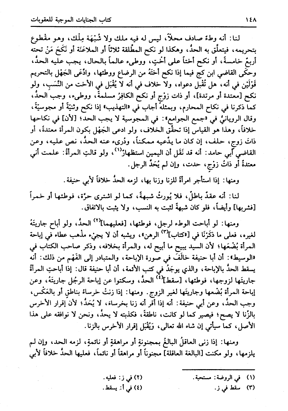 ومنها: إذا زنى العاقلُ البالغُ بمجنونةٍ أو مراهقةٍ أو نائمةٍ، لزمه الحد، وإن لم يلزمها، ولو مكنت [البالغة العاقلة] مجنوناً أو مراهقاً أو نائماً، فعليها الحدُّ خلافاً لأبي
