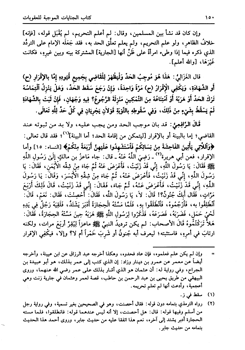 قال الغَزَالِيُّ: هَذَا هُوَ مُوجِبُ الحَدِّ وَلْيَظْهَرْ لِلْقَاضِي بِجَمِيعِ قُيُودِهِ إمَّا بالإِقْرَارِ (ح) أَو الشَّهَادَةِ، وَيَكْفِي الإِقْرَارُ (ح) مَرَّةً وَاحِدَةً، وَإِنْ رَجَعَ سَقَط الحَدَّ، وَهَلْ يَنْزِلُ التِمَاسُهُ تَرْكَ الحَدِّ أَوْ هَرَبُهُ أَوْ امْتِنَاعُهُ مِنَ التَّمْكِينِ مَنْزِلَةَ الرُّجُوعُ؟ فِيهِ وَجْهَانِ، فَإنْ ثَبَتَ بِالشَّهَادَةِ لَمْ يَسْقُطْ بِشَيْءٍ مِنْ ذَلِكَ، وَفِى سُقُوطِهِ بالتَّوْبَه قَوْلاَنِ يَجْرِيَانِ فِي كُلِّ حَدٍّ للهِ تَعَالَى.